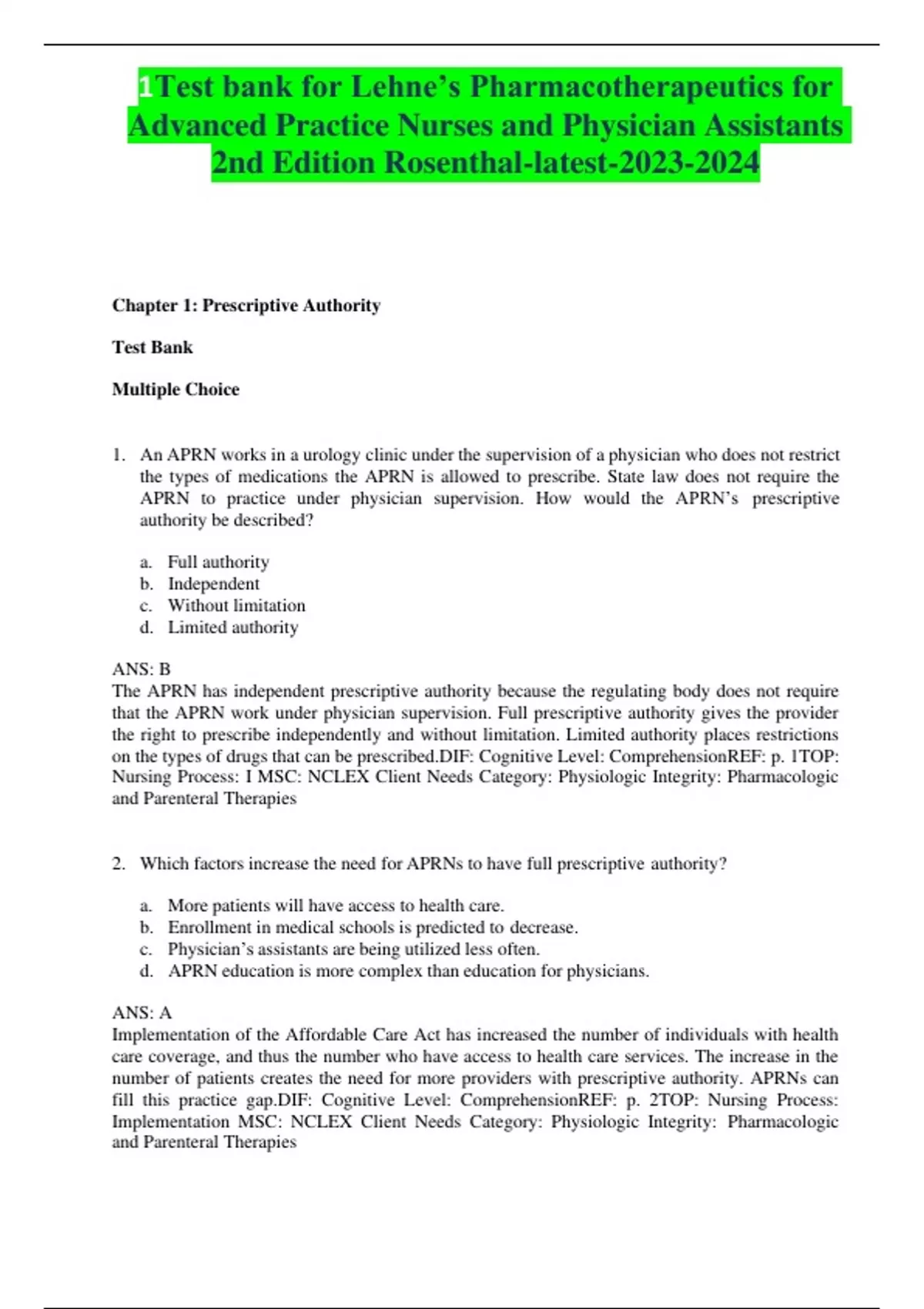 Test bank for Lehne’s Pharmacotherapeutics for Advanced Practice Nurses and Physician Assistants 2nd Edition Rosenthal-latest-