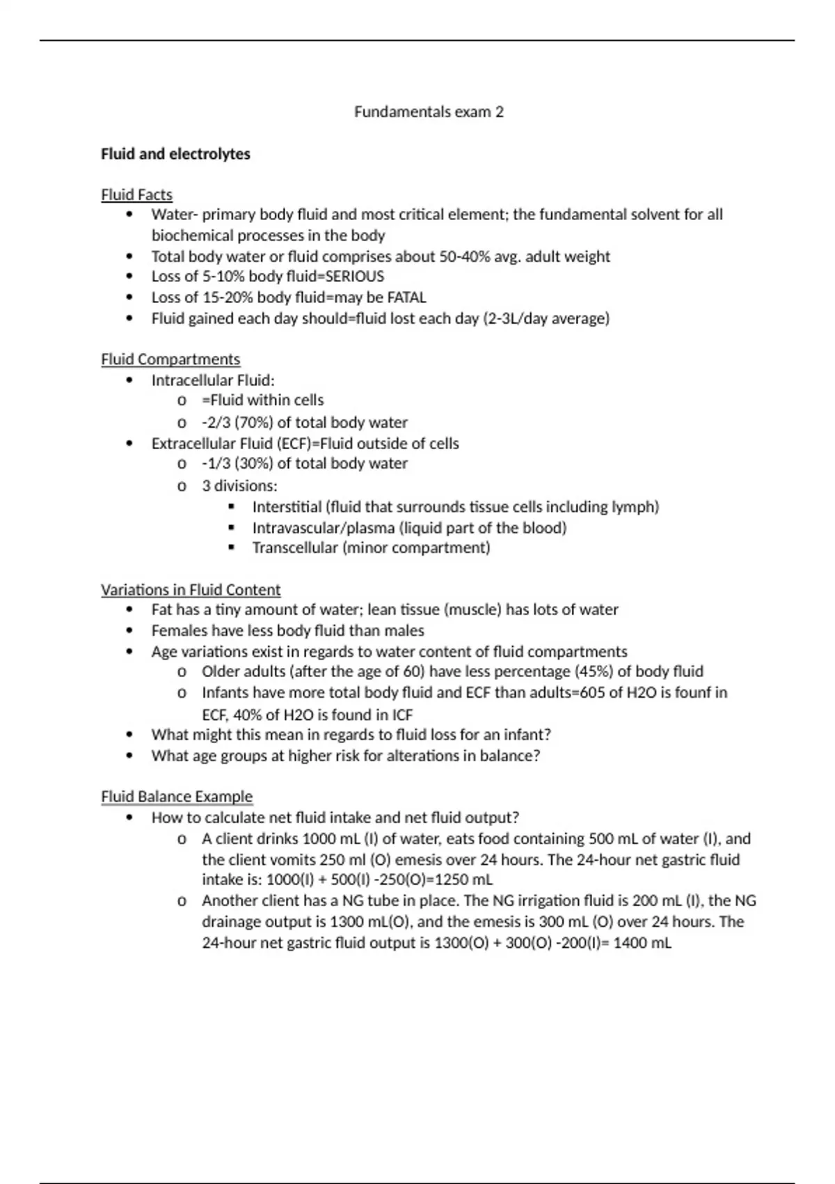 Fundamentals exam 2 Fluid and electrolytes Fluid Facts Water- primary body fluid and most critical element; the fundamental solvent for all biochemical processes in the body Total body water or fluid comprises about 50-40% avg. adult weight Loss of 5-10% body fluid=SERIOUS Loss of 15-20% body fluid=may be FATAL Fluid gained each day should=fluid lost each day (2-3L/day average) Fluid Compartments Intracellular Fluid: o =Fluid within cells o -2/3 (70%) of total body water Extracellular Fluid (ECF)=Fluid outside of cells o -1/3 (30%) of total body water o 3 divisions: Interstitial (fluid that surrounds tissue cells including lymph) Intravascular/plasma (liquid part of the blood) Transcellular (minor compartment) Variations in Fluid Content Fat has a tiny amount of water; lean tissue (muscle) has lots of water Females have less body fluid than males Age variations exist in regards to water content of fluid compartments o Older adults (after the age of 60) have less percentage (45%) of body fluid o Infants have more total body fluid and ECF than adults=605 of H2O is founf in ECF, 40% of H2O is found in ICF What might this mean in regards to fluid loss for an infant? What age groups at higher risk for alterations in balance? Fluid Balance Example How to calculate net fluid intake and net fluid output? o A client drinks 1000 mL (I) of water, eats food containing 500 mL of water (I), and the client vomits 250 ml (O) emesis over 24 hours. The 24-hour net gastric fluid intake is: 1000(I) + 500(I) -250(O)=1250 mL o Another client has a NG tube in place. The NG irrigation fluid is 200 mL (I), the NG drainage output is 1300 mL(O), and the emesis is 300 mL (O) over 24 hours. The 24-hour net gastric fluid output is 1300(O) + 300(O) -200(I)= 1400 mL Electrolytes Works with fluid to keep the body healthy and in balance They are solutes that are found in various concentrations and measures in terms of milliequivalents (mEq) unit Can be negatively charged (anions) or positively charged (cations) For homeostasis body needs: Total body anions (e.g. chloride, bicarbonate, phosphate) =Total body cations (e.g. sodium, potassium, calcium, hydrogen, magnesium) Major electrolytes in the ECF include sodium, chloride, calcium, bicarbonate Major electrolytes in the ICF include potassium, phosphorus, magnesium Regulation and Homeostatic Mechanism of Fluid and Electrolyte Balance Osmosis o Major method of transporting body fluid o Movement of water (or other solute) from an area of lesser to one of greater concentration Diffusion o Passive movement of electrolytes or other particles down the concentration gradient (from higher to lower concentration) Active transport o Movement of ions against osmotic pressure to an area of higher pressure; requires energy Capillary filtration o Movement across a membrane, under pressure, from higher to lower pressure Osmosis, Diffusion and Active Transport Filtration and Osmosis Osmolarity and IV Fluid Normal serum (blood0 osmolality=275-295 mOsm/L Isotonic solution: A solution that has osmolarity equal to serum (blood) Hypotonic solution: A solution that has LOW osmolarity is one that is <serum osmolarity Hypertonic solution: A solution that has HIGH osmolarity is one that is ?serum osmolarity IV Fluid-Isotonic Total osmolality close to that of the ECF; replace ECF 0.9% Sodium Chloride (NS- normal saline) Lactated Ringer’s Solution o Has the same osmolality as blood solutions on both sides of the semipermeable membrane are equal in concentration. Expand the blood volume without causing a shift from one compartment to another o Expands ECF and ICF volume o Used to treat fluid volume deficit from hemorrhage, severe vomiting and diarrhea, heavy drainage from GI suction, fistulas and wounds; 1st line resuscitation fluid IV Fluid-Hypotonic Hypotonic to plasma; replace ICF 0.45% NS(1/2-strength normal saline) 0.33% NS(1/3-strength normal saline) o A solution of lower osmotic pressure moves fluid into the cells, causing them to expand. Shift ECF to ICF with decrease in ECF o Used to “dilute” plasma particularly in hypernatremia o Treats cellular dehydration (as in diabetic ketoacidosis) and hypernatremia (high serum Na+) o Do not use for patients with increased intracranial pressure risk or third spacing risk increased fluid to brain cells and third space o Can worsen existing hypovolemia and hypotension-fluid pulled out of IVC