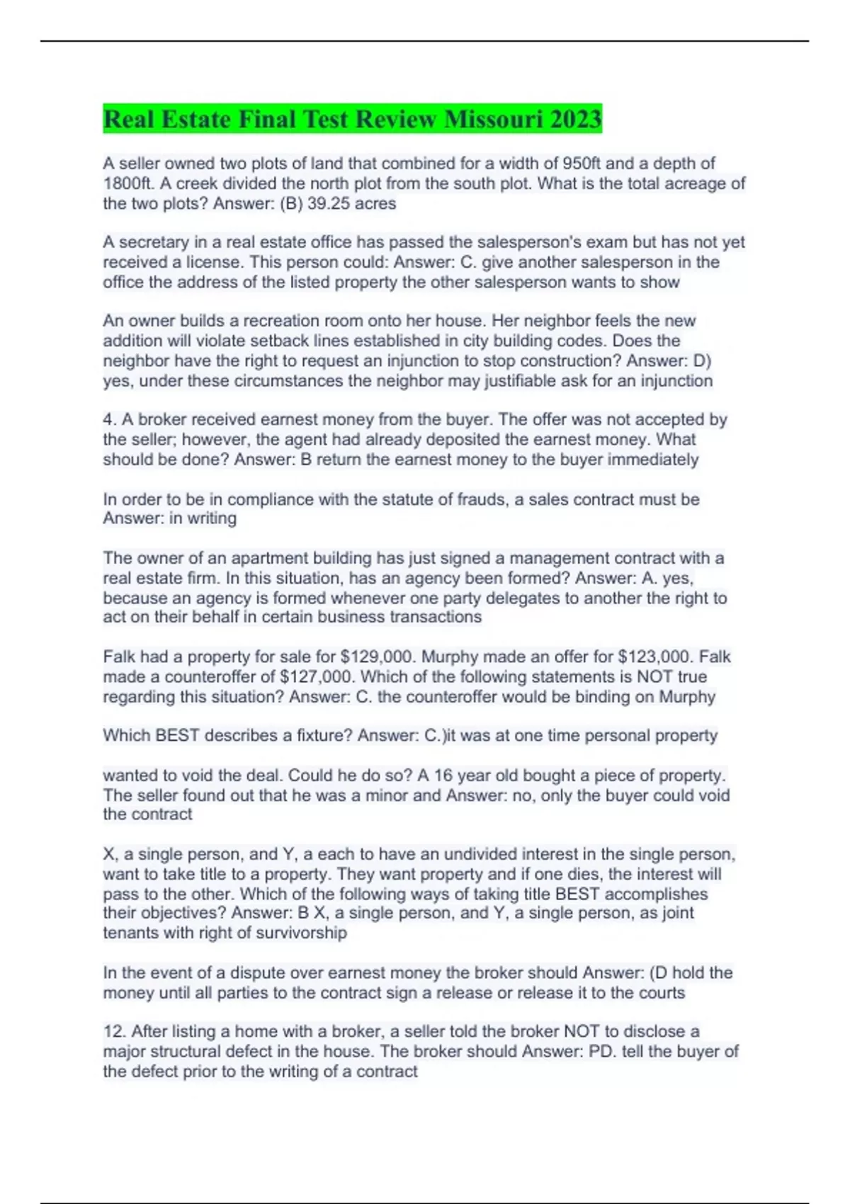 Real Estate Final Test Review Missouri 2023 A seller owned two plots of land that combined for a width of 950ft and a depth of 1800ft. A creek divided the north plot from the south plot. What is the total acreage of the two plots? Answer: (B) 39.25 acres A secretary in a real estate office has passed the salesperson's exam but has not yet received a license. This person could: Answer: C. give another salesperson in the office the address of the listed property the other salesperson wants to show An owner builds a recreation room onto her house. Her neighbor feels the new addition will violate setback lines established in city building codes. Does the neighbor have the right to request an injunction to stop construction? Answer: D) yes, under these circumstances the neighbor may justifiable ask for an injunction 4. A broker received earnest money from the buyer. The offer was not accepted by the seller; however, the agent had already deposited the earnest money. What should be done? Answer: B return the earnest money to the buyer immediately In order to be in compliance with the statute of frauds, a sales contract must be Answer: in writing The owner of an apartment building has just signed a management contract with a real estate firm. In this situation, has an agency been formed? Answer: A. yes, because an agency is formed whenever one party delegates to another the right to act on their behalf in certain business transactions Falk had a property for sale for $129,000. Murphy made an offer for $123,000. Falk made a counteroffer of $127,000. Which of the following statements is NOT true regarding this situation? Answer: C. the counteroffer would be binding on Murphy Which BEST describes a fixture? Answer: C.)it was at one time personal property wanted to void the deal. Could he do so? A 16 year old bought a piece of property. The seller found out that he was a minor and Answer: no, only the buyer could void the contract X, a single person, and Y, a each to have an undivided interest in the single person, want to take title to a property. They want property and if one dies, the interest will pass to the other. Which of the following ways of taking title BEST accomplishes their objectives? Answer: B X, a single person, and Y, a single person, as joint tenants with right of survivorship In the event of a dispute over earnest money the broker should Answer: (D hold the money until all parties to the contract sign a release or release it to the courts 12. After listing a home with a broker, a seller told the broker NOT to disclose a major structural defect in the house. The broker should Answer: PD. tell the buyer of the defect prior to the writing of a contract To create a joint tenancy relationship in the ownership of real estate, there must be unity of Answer: C. possession, time, interest and title A seller had his home listed with a broker. During the listing period, the seller found seller and won. What type of listing did the broker most likely have? his own buyer and refused to pay the broker's commission. The broker then sued the Answer: A an exclusive right to sell listing A property manager normally is charged with all the following duties except: Answer: D repairing a tenants fixture In 1988, John Smith built a 3 story apartment building. To comply with the Federal Fair Housing: Answer: A handicap tenants would need to have access to at least the 1st floor Elective credits for continuing education could be granted for a course: Answer: That