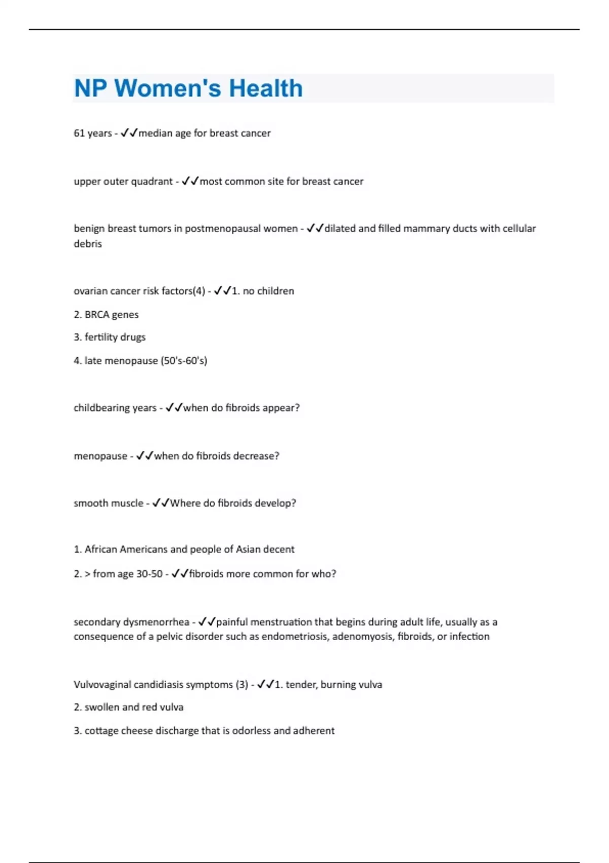 61 years - median age for breast cancer upper outer quadrant - most common site for breast cancer benign breast tumors in postmenopausal women - dilated and filled mammary ducts with cellular debris ovarian cancer risk factors(4) - 1. no children 2. BRCA genes 3. fertility drugs 4. late menopause (50's-60's) childbearing years - when do fibroids appear? menopause - when do fibroids decrease? smooth muscle - Where do fibroids develop? 1. African Americans and people of Asian decent 2. > from age 30-50 - fibroids more common for who? secondary dysmenorrhea - painful menstruation that begins during adult life, usually as a consequence of a pelvic disorder such as endometriosis, adenomyosis, fibroids, or infection Vulvovaginal candidiasis symptoms (3) - 1. tender, burning vulva 2. swollen and red vulva 3. cottage cheese discharge that is odorless and adherentdiabetes - if candida infection is frequent check for?