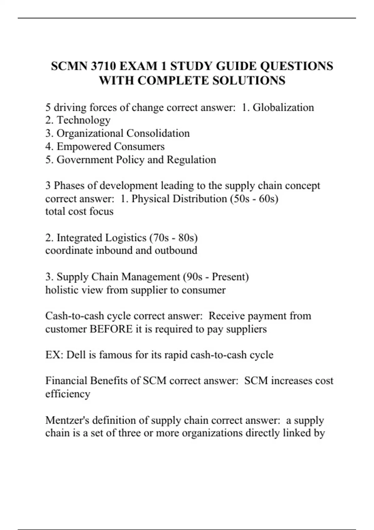 5 driving forces of change correct answer: 1. Globalization 2. Technology 3. Organizational Consolidation 4. Empowered Consumers 5. Government Policy and Regulation 3 Phases of development leading to the supply chain concept correct answer: 1. Physical Distribution (50s - 60s) total cost focus 2. Integrated Logistics (70s - 80s) coordinate inbound and outbound 3. Supply Chain Management (90s - Present) holistic view from supplier to consumer Cash-to-cash cycle correct answer: Receive payment from customer BEFORE it is required to pay suppliers EX: Dell is famous for its rapid cash-to-cash cycle Financial Benefits of SCM correct answer: SCM increases cost efficiency Mentzer's definition of supply chain correct answer: a supply chain is a set of three or more organizations directly linked by one or more of upstream and downstream flows of products, services, finances, and information from a source to a customer Elements of logistics correct answer: -the work required to move and position inventory throughout a supply chain -the movement and storage activities that are associated with product and service flow in the focal organization