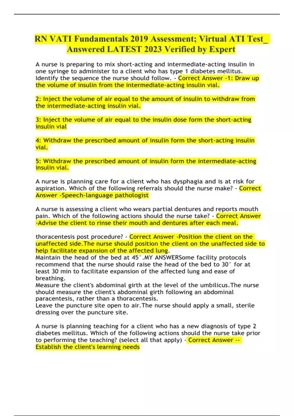 RN VATI Fundamentals 2019 Assessment; Virtual ATI Test_ Answered LATEST 2023 Verified by Expert A nurse is preparing to mix short-acting and intermediate-acting insulin in one syringe to administer to a client who has type 1 diabetes mellitus. Identify the sequence the nurse should follow A nurse is planning care for a client who has dysphagia and is at risk for aspiration. Which of the following referrals should the nurse make? A nurse is assessing a client who wears partial dentures and reports mouth pain. Which of the following actions should the nurse take? thoracentesis post procedure?