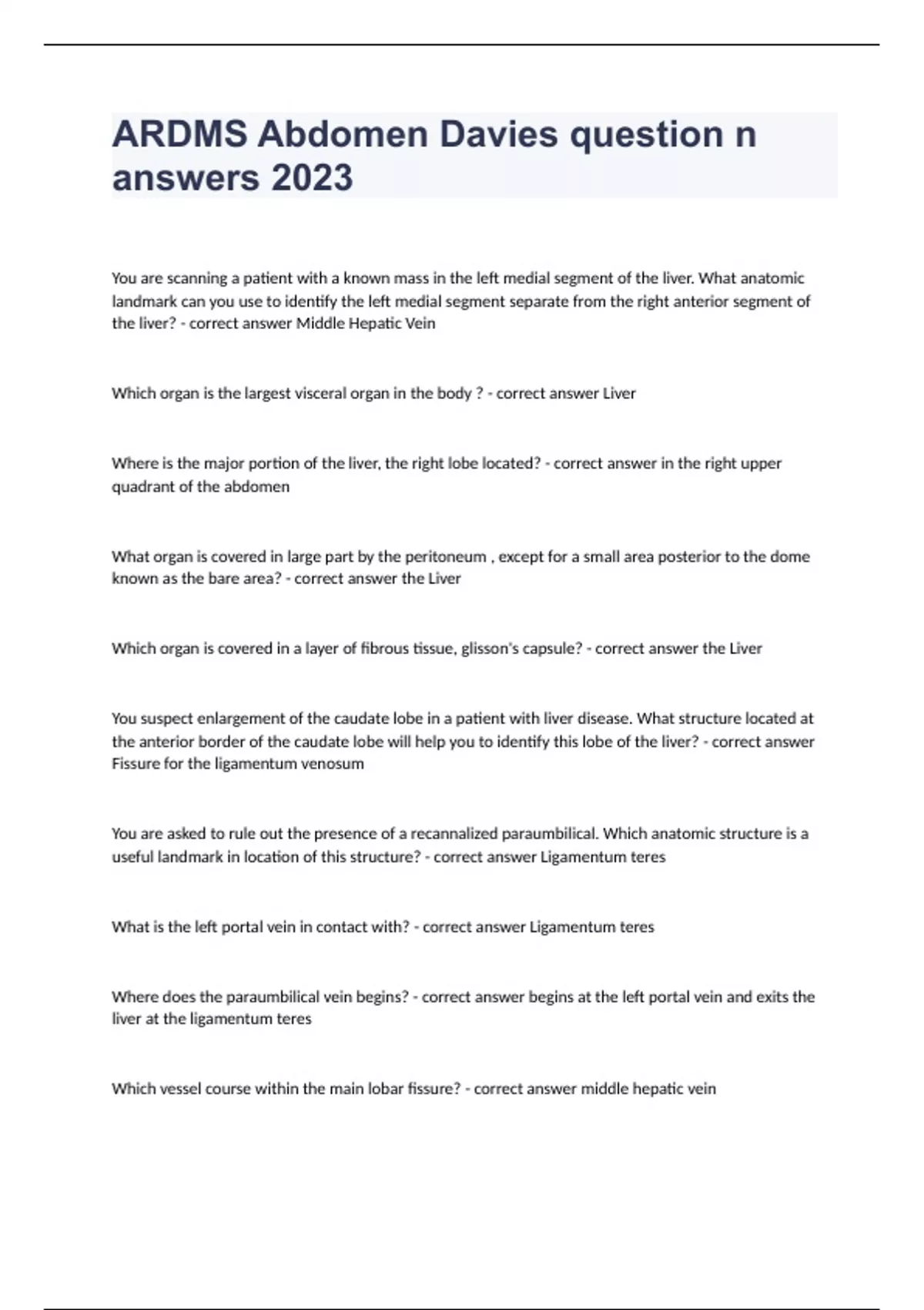 ARDMS Abdomen Davies question n answers 2023 You are scanning a patient with a known mass in the left medial segment of the liver. What anatomic landmark can you use to identify the left medial segment separate from the right anterior segment of the liver? - correct answer Middle Hepatic Vein Which organ is the largest visceral organ in the body ? - correct answer Liver Where is the major portion of the liver, the right lobe located? - correct answer in the right upper quadrant of the abdomen What organ is covered in large part by the peritoneum , except for a small area posterior to the dome known as the bare area? - correct answer the Liver Which organ is covered in a layer of fibrous tissue, glisson's capsule? - correct answer the Liver You suspect enlargement of the caudate lobe in a patient with liver disease. What structure located at the anterior border of the caudate lobe will help you to identify this lobe of the liver? - correct answer Fissure for the ligamentum venosum You are asked to rule out the presence of a recannalized paraumbilical. Which anatomic structure is a useful landmark in location of this structure? - correct answer Ligamentum teres What is the left portal vein in contact with? - correct answer Ligamentum teres Where does the paraumbilical vein begins? - correct answer begins at the left portal vein and exits the liver at the ligamentum teres Which vessel course within the main lobar fissure? - correct answer middle hepatic vein