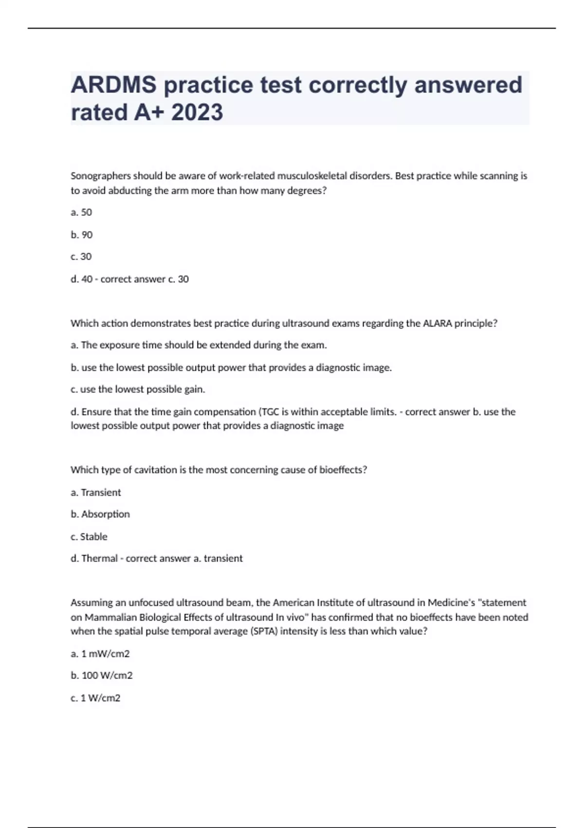 ARDMS practice test correctly answered rated A+ 2023Sonographers should be aware of work-related musculoskeletal disorders. Best practice while scanning is to avoid abducting the arm more than how many degrees? a. 50 b. 90 c. 30 d. 40 - correct answer c. 30 Which action demonstrates best practice during ultrasound exams regarding the ALARA principle? a. The exposure time should be extended during the exam. b. use the lowest possible output power that provides a diagnostic image. c. use the lowest possible gain. d. Ensure that the time gain compensation (TGC is within acceptable limits. - correct answer b. use the lowest possible output power that provides a diagnostic image Which type of cavitation is the most concerning cause of bioeffects? a. Transient b. Absorption c. Stable d. Thermal - correct answer a. transient Assuming an unfocused ultrasound beam, the American Institute of ultrasound in Medicine's "statement on Mammalian Biological Effects of ultrasound In vivo" has confirmed that no bioeffects have been noted when the spatial pulse temporal average (SPTA) intensity is less than which value? a. 1 mW/cm2 b. 100 W/cm2 c. 1 W/cm2