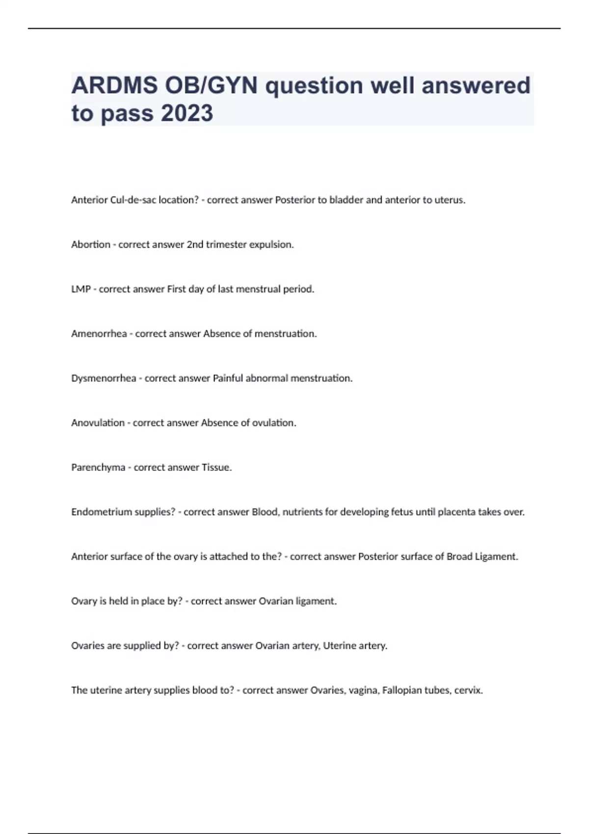 ARDMS OB/GYN question well answered to pass 2023Anterior Cul-de-sac location? - correct answer Posterior to bladder and anterior to uterus. Abortion - correct answer 2nd trimester expulsion. LMP - correct answer First day of last menstrual period. Amenorrhea - correct answer Absence of menstruation. Dysmenorrhea - correct answer Painful abnormal menstruation. Anovulation - correct answer Absence of ovulation. Parenchyma - correct answer Tissue. Endometrium supplies? - correct answer Blood, nutrients for developing fetus until placenta takes over. Anterior surface of the ovary is attached to the? - correct answer Posterior surface of Broad Ligament. Ovary is held in place by? - correct answer Ovarian ligament. Ovaries are supplied by? - correct answer Ovarian artery, Uterine artery. The uterine artery supplies blood to? - correct answer Ovaries, vagina, Fallopian tubes, cervix.