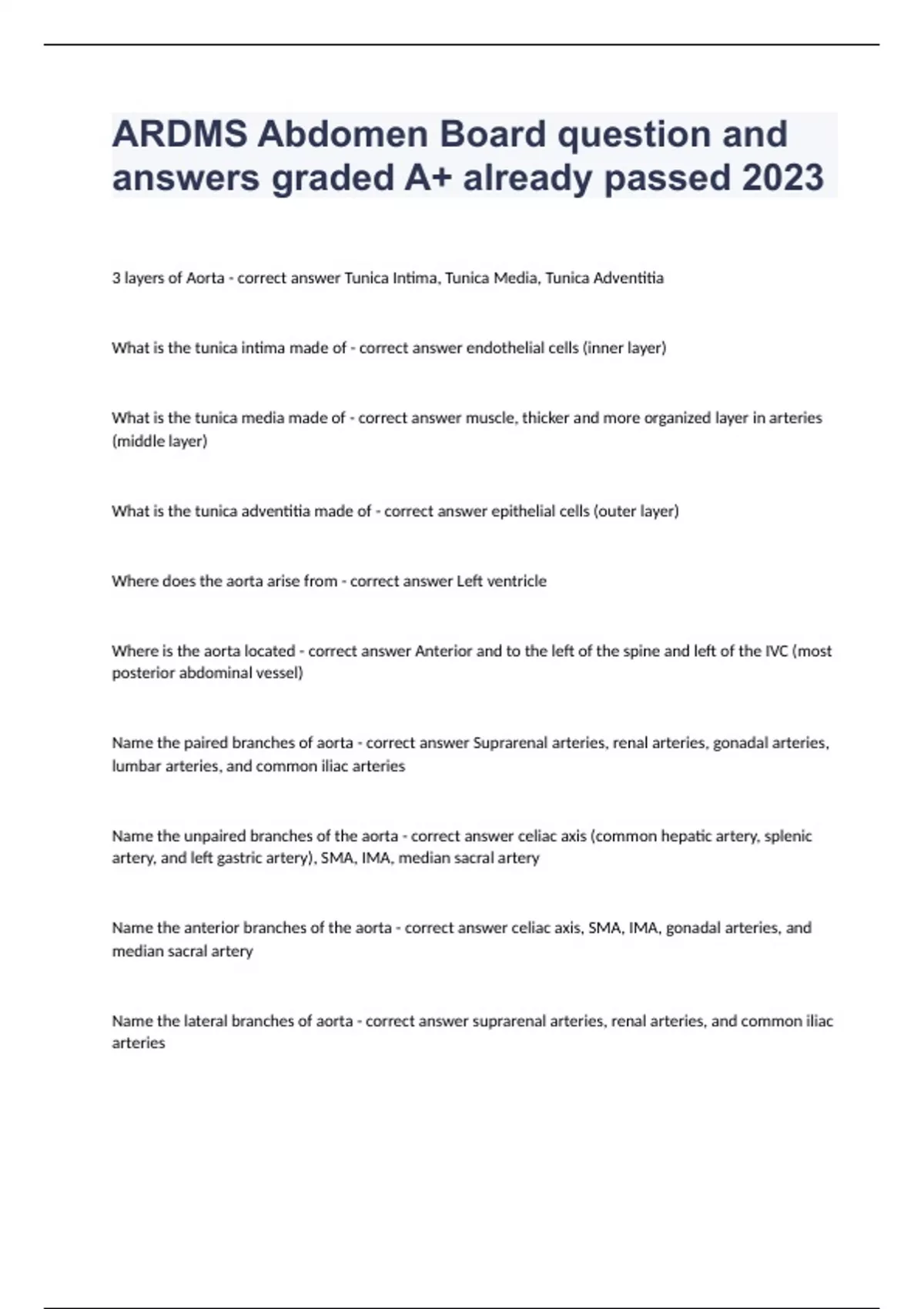 ARDMS Abdomen Board question and answers graded A+ already passed 20233 layers of Aorta - correct answer Tunica Intima, Tunica Media, Tunica Adventitia What is the tunica intima made of - correct answer endothelial cells (inner layer) What is the tunica media made of - correct answer muscle, thicker and more organized layer in arteries (middle layer) What is the tunica adventitia made of - correct answer epithelial cells (outer layer) Where does the aorta arise from - correct answer Left ventricle Where is the aorta located - correct answer Anterior and to the left of the spine and left of the IVC (most posterior abdominal vessel) Name the paired branches of aorta - correct answer Suprarenal arteries, renal arteries, gonadal arteries, lumbar arteries, and common iliac arteries Name the unpaired branches of the aorta - correct answer celiac axis (common hepatic artery, splenic artery, and left gastric artery), SMA, IMA, median sacral artery Name the anterior branches of the aorta - correct answer celiac axis, SMA, IMA, gonadal arteries, and median sacral artery Name the lateral branches of aorta - correct answer suprarenal arteries, renal arteries, and common iliac arteries Where do the common iliac arteries bifurcate - correct answer L3-4 Average normal proximal measurement of aorta - correct answer 2.0 - 2.6 cm Average normal mid measurement of aorta - correct answer 1.6 - 2.4 cm