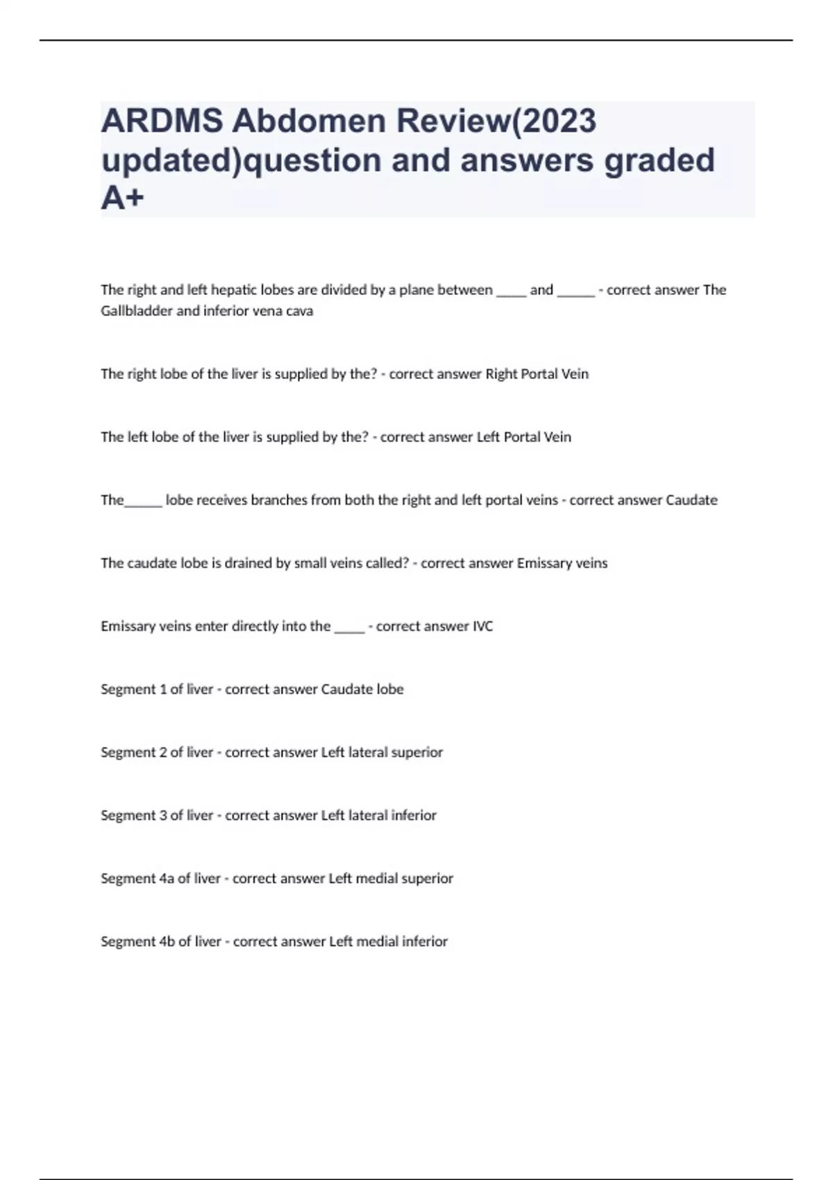 ARDMS Abdomen Review(2023 updated)question and answers graded A+ The right and left hepatic lobes are divided by a plane between ____ and _____ - correct answer The Gallbladder and inferior vena cava The right lobe of the liver is supplied by the? - correct answer Right Portal Vein The left lobe of the liver is supplied by the? - correct answer Left Portal Vein The_____ lobe receives branches from both the right and left portal veins - correct answer Caudate The caudate lobe is drained by small veins called? - correct answer Emissary veins Emissary veins enter directly into the ____ - correct answer IVC Segment 1 of liver - correct answer Caudate lobe Segment 2 of liver - correct answer Left lateral superior Segment 3 of liver - correct answer Left lateral inferior Segment 4a of liver - correct answer Left medial superior Segment 4b of liver - correct answer Left medial inferior