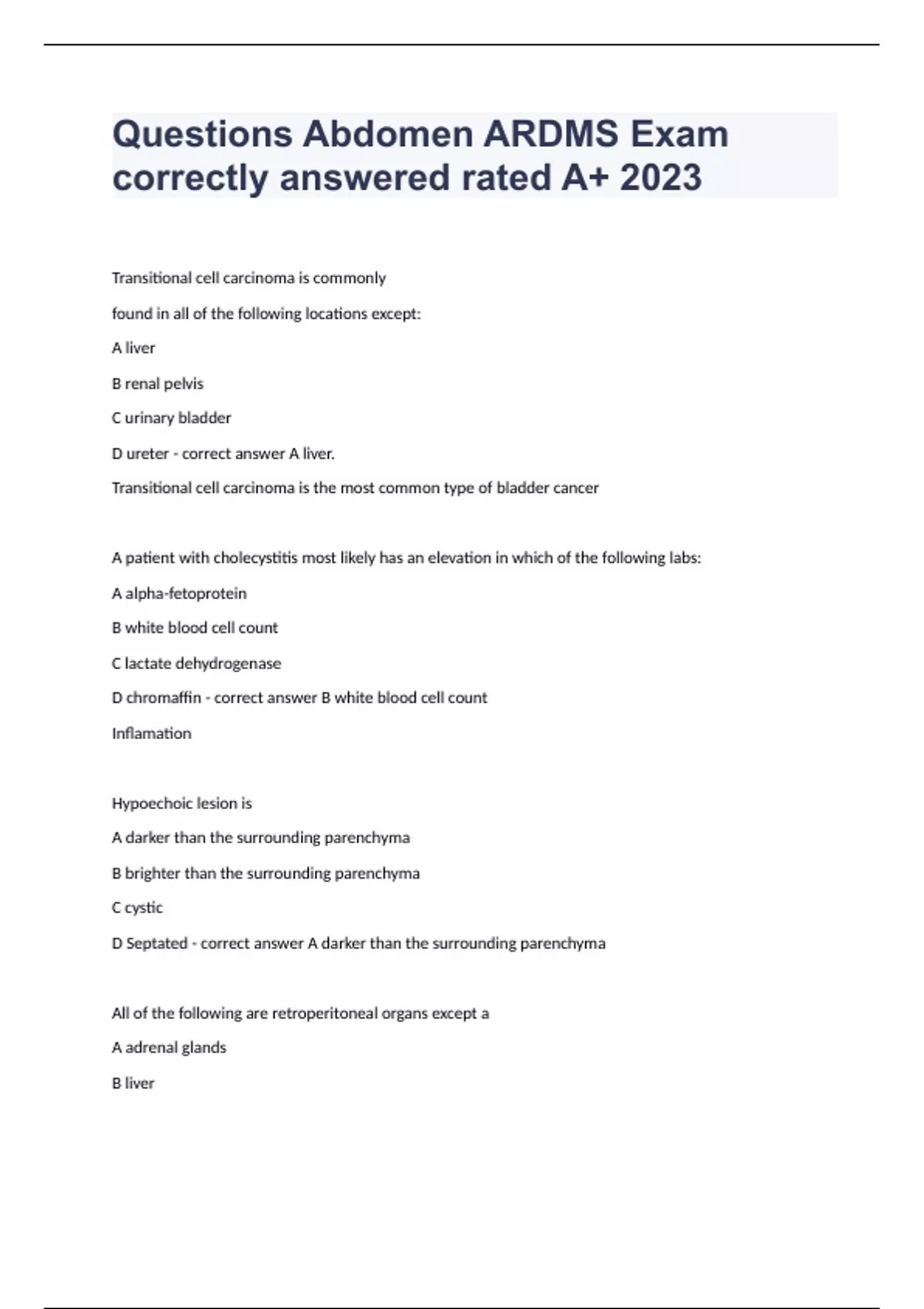 Questions Abdomen ARDMS Exam correctly answered rated A+ 2023 Transitional cell carcinoma is commonly found in all of the following locations except: A liver B renal pelvis C urinary bladder D ureter - correct answer A liver. Transitional cell carcinoma is the most common type of bladder cancer A patient with cholecystitis most likely has an elevation in which of the following labs: A alpha-fetoprotein B white blood cell count C lactate dehydrogenase D chromaffin - correct answer B white blood cell count Inflamation Hypoechoic lesion is A darker than the surrounding parenchyma B brighter than the surrounding parenchyma C cystic D Septated - correct answer A darker than the surrounding parenchyma All of the following are retroperitoneal organs except a A adrenal glands B liver C kidneys D pancreas - correct answer B liver Mnemonic to remember the retroperitoneal organs is abdominal viscera are retroperitoneal is SAD PUCKER: S = Suprarenal (adrenal) Glands A = Aorta/IVC D =Duodenum (except the proximal 2cm, the duodenal cap) P = Pancreas (except the tail) U = Ureters C = Colon (ascending and descending parts) K = Kidneys E = (O)esophagus R = Rectum What is another name for renal cell carcinoma? A nephroblastoma B neuroblastoma C mesoblastic nephroma D hypernephorma - correct answer D hypernephorma Reverberation artifact that exhibits echogenic linear focus posterior to tiny gas bubbles most likely represents, A mirror image artifact B posterior shadowing C comet tail artifact D ring down artifact - correct answer C comet tail artifact The arrow is pointing to A renal cysts