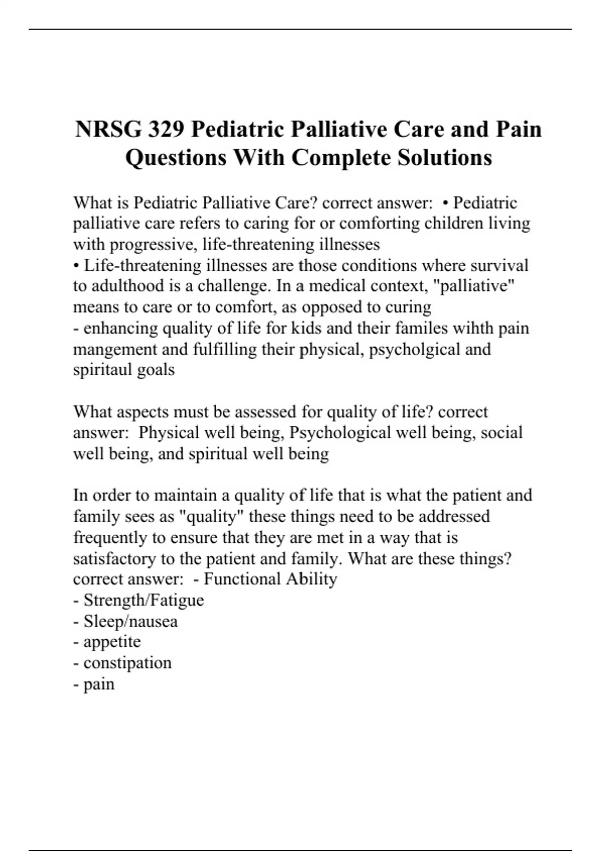 NRSG 329 Pediatric Palliative Care and Pain Questions With Complete Solutions