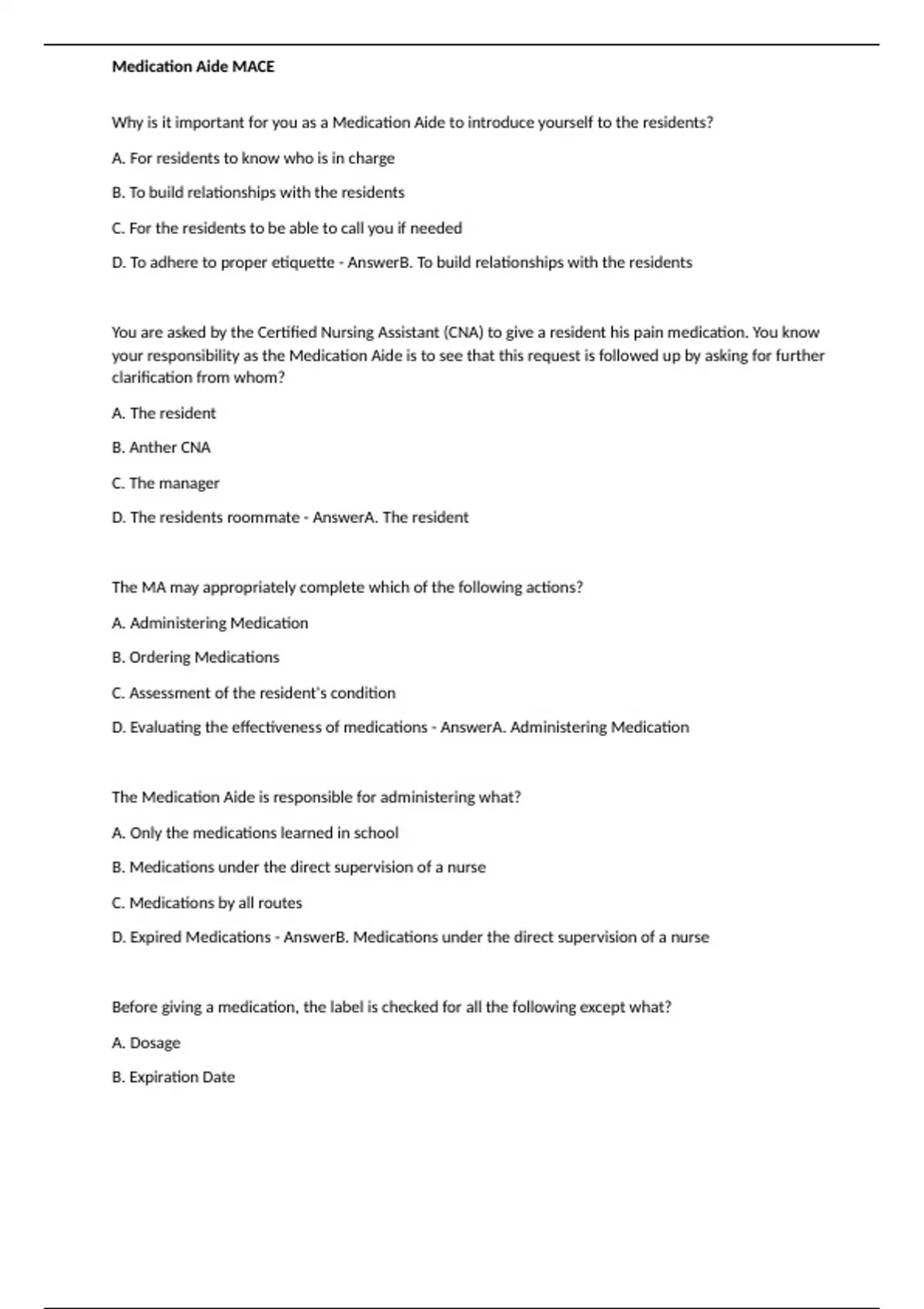 medication aide mace exam questions and answers wi