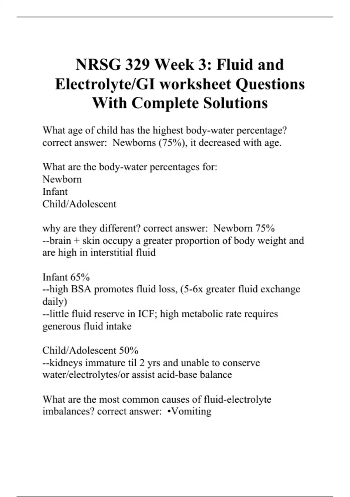 NRSG 329 Week 3: Fluid and Electrolyte/GI worksheet Questions With Complete Solutions