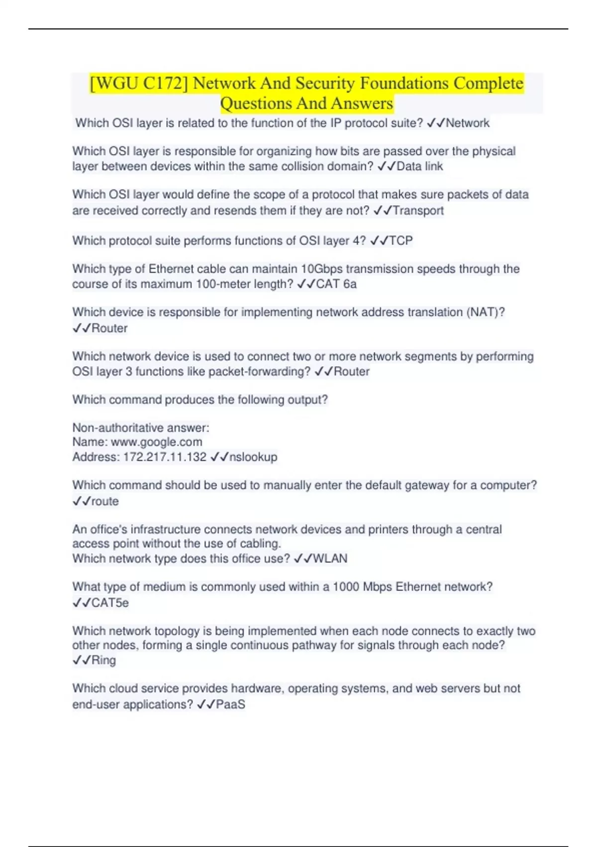 [WGU C172] Network And Security Foundations Complete Questions And Answers