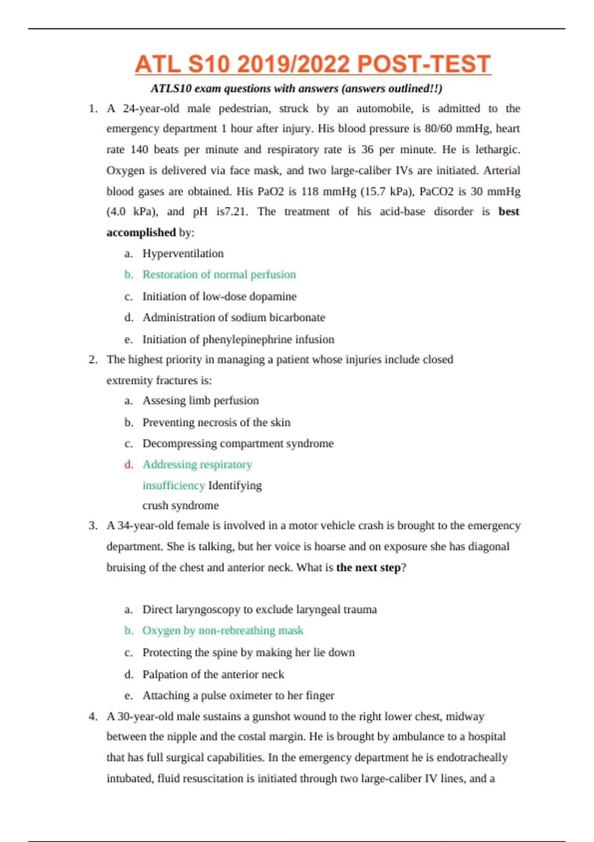 A 24-year-old male pedestrian, struck by an automobile, is admitted to the emergency department 1 hour after injury. His blood pressure is 80/60 mmHg, heart rate 140 beats per minute and respiratory rate is 36 per minute. He is lethargic. Oxygen is delivered via face mask, and two large-caliber IVs are initiated. Arterial blood gases are obtained. His PaO2 is 118 mmHg (15.7 kPa), PaCO2 is 30 mmHg (4.0 kPa), and pH is7.21. The treatment of his acid-base disorder is best accomplished by: a. Hyperventilation b. Restoration of normal perfusion c. Initiation of low-dose dopamine d. Administration of sodium bicarbonate e. Initiation of phenylepinephrine infusion 2. The highest priority in managing a patient whose injuries include closed extremity fractures is: a. Assesing limb perfusion b. Preventing necrosis of the skin c. Decompressing compartment syndrome d. Addressing respiratory insufficiency Identifying crush syndrome