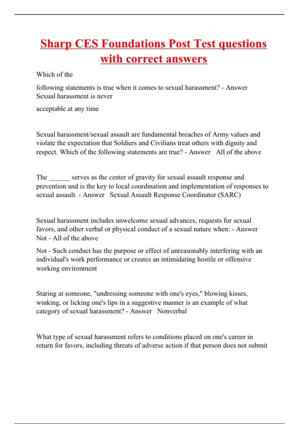 Which of the following statements is true when it comes to sexual harassment? - Answer Sexual harassment is never acceptable at any time Sexual harassment/sexual assault are fundamental breaches of Army values and violate the expectation that Soldiers and Civilians treat others with dignity and respect. Which of the following statements are true? - Answer All of the above The ______ serves as the center of gravity for sexual assault response and prevention and is the key to local coordination and implementation of responses to sexual assault. - Answer Sexual Assault Response Coordinator (SARC)