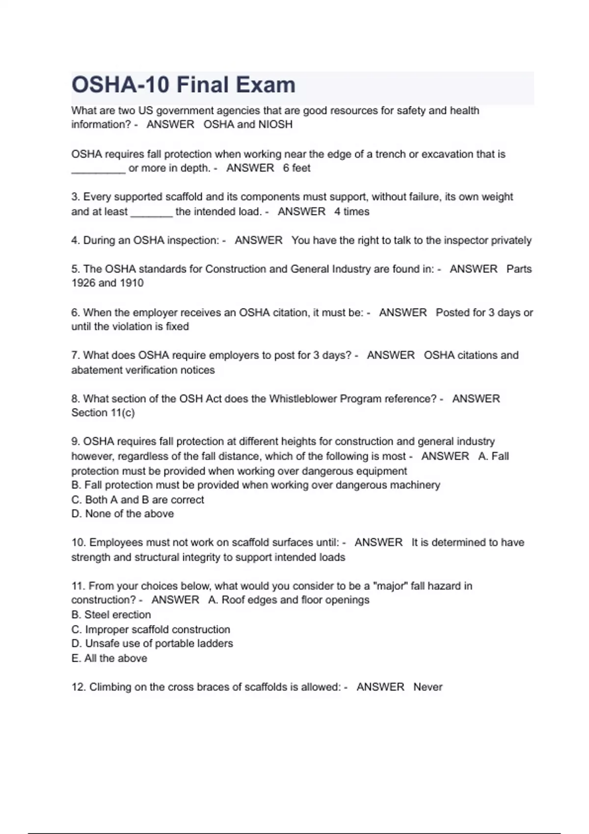 OSHA-10 Final Exam ; QUESTIONS AND ANSWERS 2023 - BEST SCORED GRADE A+
