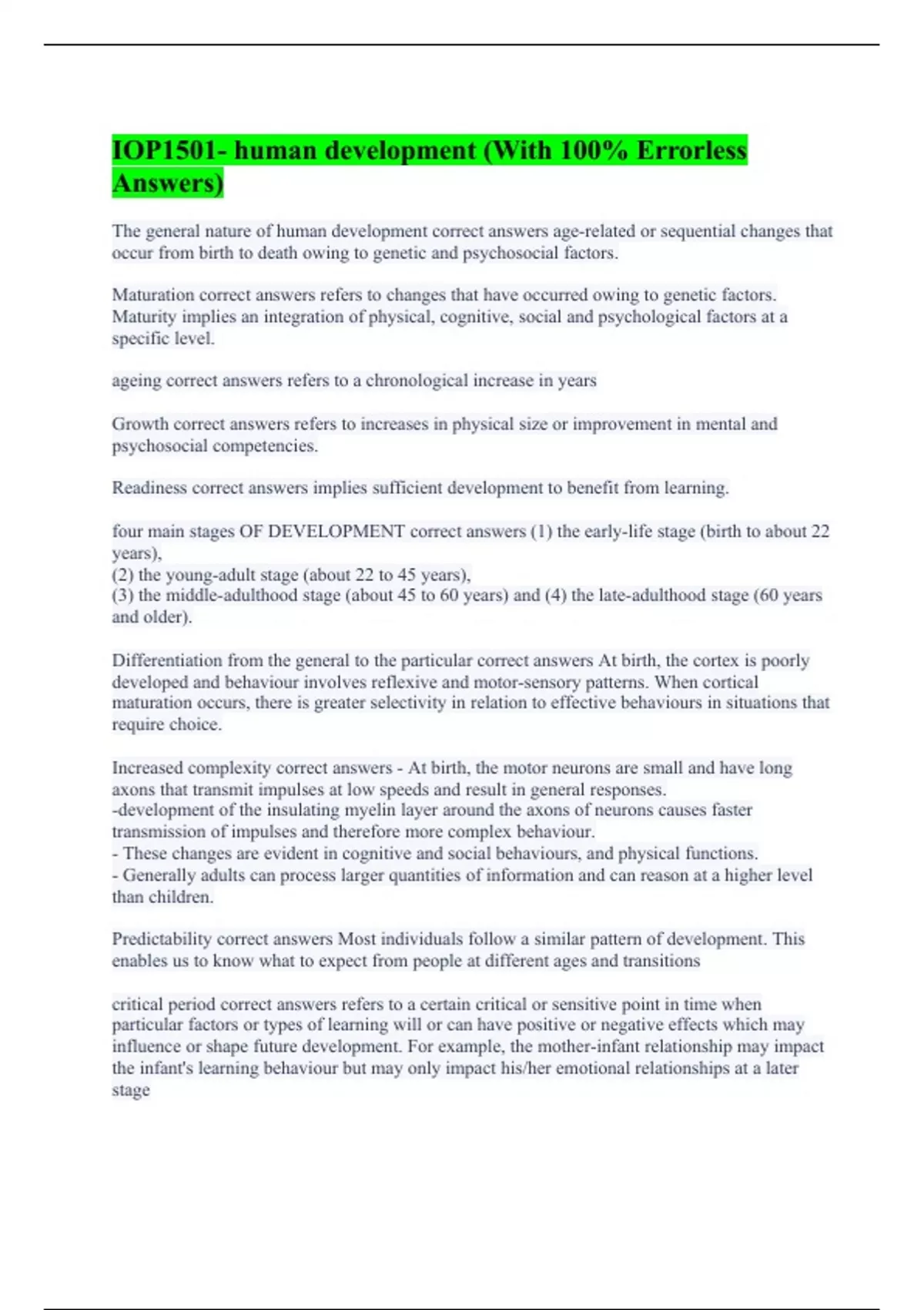 The general nature of human development correct answers age-related or sequential changes that occur from birth to death owing to genetic and psychosocial factors. Maturation correct answers refers to changes that have occurred owing to genetic factors. Maturity implies an integration of physical, cognitive, social and psychological factors at a specific level. ageing correct answers refers to a chronological increase in years Growth correct answers refers to increases in physical size or improvement in mental and psychosocial competencies. Readiness correct answers implies sufficient development to benefit from learning. four main stages OF DEVELOPMENT correct answers (1) the early-life stage (birth to about 22 years), (2) the young-adult stage (about 22 to 45 years), (3) the middle-adulthood stage (about 45 to 60 years) and (4) the late-adulthood stage (60 years and older). Differentiation from the general to the particular correct answers At birth, the cortex is poorly developed and behaviour involves reflexive and motor-sensory patterns. When cortical maturation occurs, there is greater selectivity in relation to effective behaviours in situations that require choice. Increased complexity correct answers - At birth, the motor neurons are small and have long axons that transmit impulses at low speeds and result in general responses. -development of the insulating myelin layer around the axons of neurons causes faster transmission of impulses and therefore more complex behaviour. - These changes are evident in cognitive and social behaviours, and physical functions. - Generally adults can process larger quantities of information and can reason at a higher level than children. Predictability correct answers Most individuals follow a similar pattern of development. This enables us to know what to expect from people at different ages and transitions critical period correct answers refers to a certain critical or sensitive point in time when particular factors or types of learning will or can have positive or negative effects which may influence or shape future development. For example, the mother-infant relationship may impact the infant's learning behaviour but may only impact his/her emotional relationships at a later stage