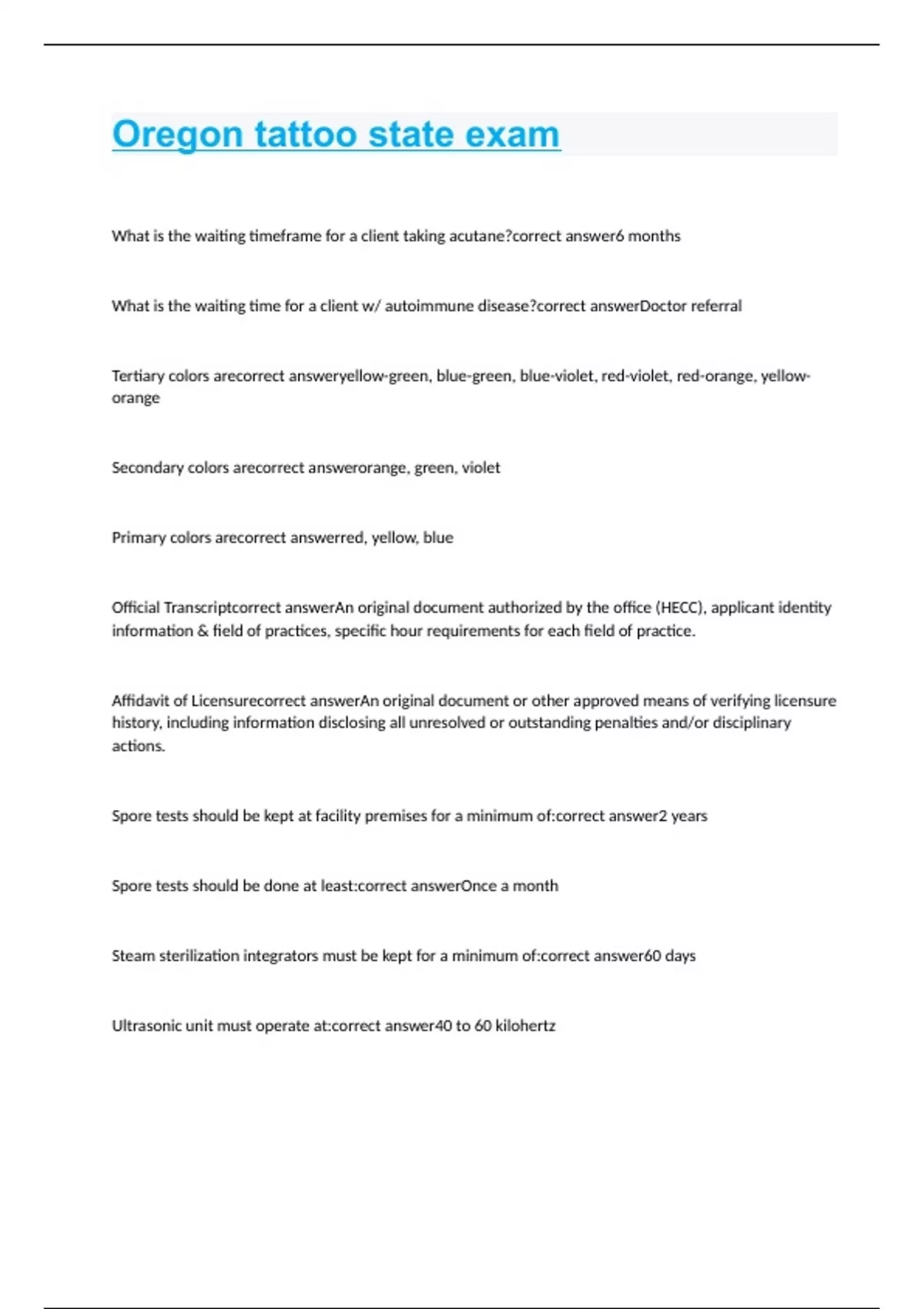 What is the waiting timeframe for a client taking acutane? 6 months What is the waiting time for a client w/ autoimmune disease? Doctor referral Tertiary colors are yellow-green, blue-green, blue-violet, red-violet, red-orange, yellow-orange Secondary colors are orange, green, violet Primary colors are red, yellow, blue Official Transcript An original document authorized by the office (HECC), applicant identity information & field of practices, specific hour requirements for each field of practice. Affidavit of Licensure An original document or other approved means of verifying licensure history, including information disclosing all unresolved or outstanding penalties and/or disciplinary actions. Spore tests should be kept at facility premises for a minimum of: 2 years Spore tests should be done at least: Once a month Steam sterilization integrators must be kept for a minimum of: 60 days Ultrasonic unit must operate at: 40 to 60 kilohertz Inks, dyes, or pigments: Must be purchased from a commercial supplier/ manufacturer & have an expiration date Color theory & pigments 10 hours Design, art & placement 10 hours Discretionary 10 hours Needles & needle bars 20 hours Tattoo machines 20 hours Equipment/ supplies 20 hours Skin 20 hours Client services 20 hours Business operations 20 hours Oregon laws & rules 20 hours Safety & infection control 40 hours 150 hours of: Practical training 210 hours of: Theory Sharps containers must be what? Puncture-resistant, leak-proof container that can be closed for handling, storage, transportation, & disposal. Must be labeled with the "biohazard" symbol Office (definition) Health licensing office Instruments (definition) Equipment used during tattoo services such as needles & tubes High level disinfectant A chemical agent, which has demonstrated tuberculocidal activity and is registered with the EPA FDA (definition) Food & drug administration