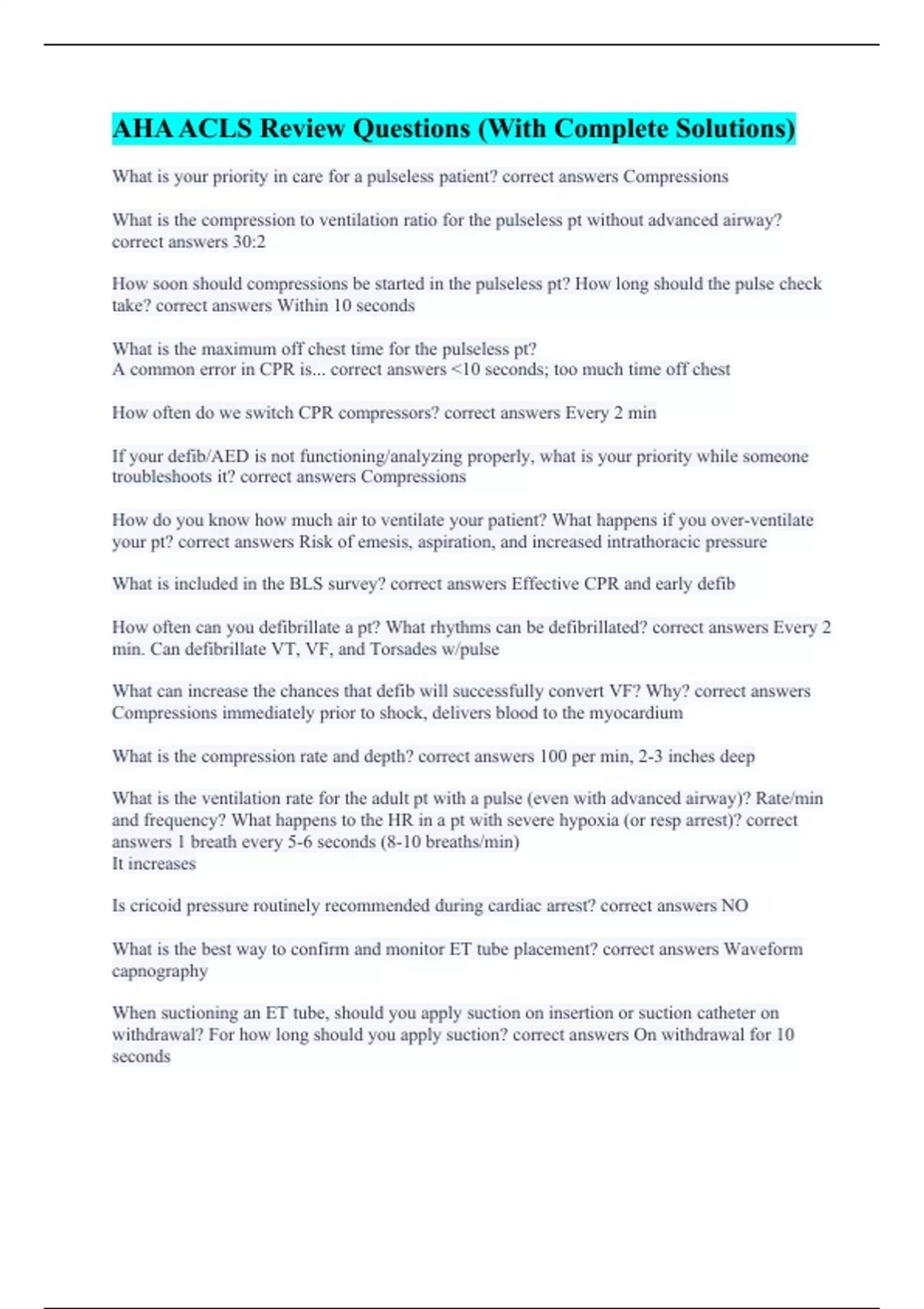AHA ACLS Review Questions (With Complete Solutions)
