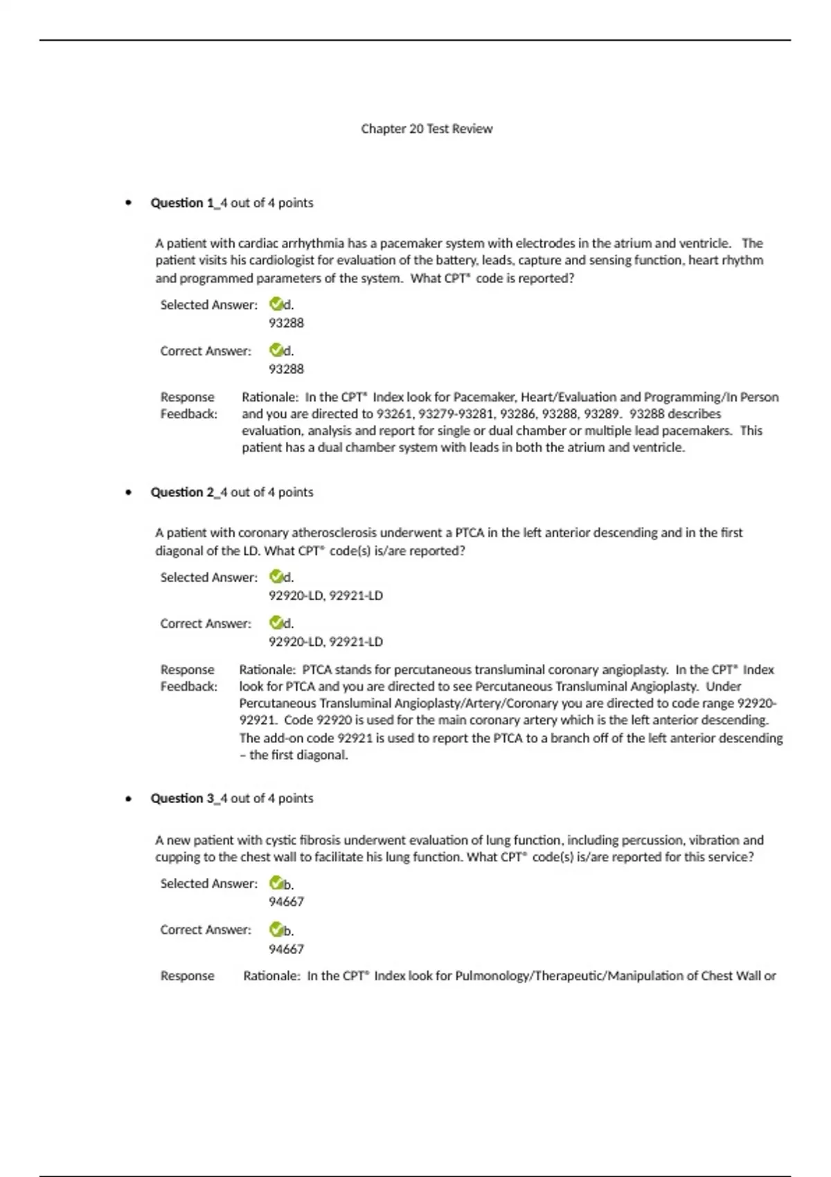 hapter 20 Test Review Question 1_4 out of 4 points A patient with cardiac arrhythmia has a pacemaker system with electrodes in the atrium and ventricle. The patient visits his cardiologist for evaluation of the battery, leads, capture and sensing function, heart rhythm and programmed parameters of the system. What CPT® code is reported? Selected Answer: d. 93288 Correct Answer: d. 93288 Response Feedback: Rationale: In the CPT® Index look for Pacemaker, Heart/Evaluation and Programming/In Person and you are directed to 93261, , 93286, 93288, 93289. 93288 describes evaluation, analysis and report for single or dual chamber or multiple lead pacemakers. This patient has a dual chamber system with leads in both the atrium and ventricle. Question 2_4 out of 4 points A patient with coronary atherosclerosis underwent a PTCA in the left anterior descending and in the first diagonal of the LD. What CPT® code(s) is/are reported? Selected Answer: d. 92920-LD, 92921-LD Correct Answer: d. 92920-LD, 92921-LD Response Feedback: Rationale: PTCA stands for percutaneous transluminal coronary angioplasty. In the CPT® Index look for PTCA and you are directed to see Percutaneous Transluminal Angioplasty. Under Percutaneous Transluminal Angioplasty/Artery/Coronary you are directed to code range 92920- 92921. Code 92920 is used for the main coronary artery which is the left anterior descending. The add-on code 92921 is used to report the PTCA to a branch off of the left anterior descending – the first diagonal. Question 3_4 out of 4 points A new patient with cystic fibrosis underwent evaluation of lung function, including percussion, vibration and cupping to the chest wall to facilitate his lung function. What CPT® code(s) is/are reported for this service? Selected Answer: b. 94667 Correct Answer: b. 94667 Response Rationale: In the CPT® Index look for