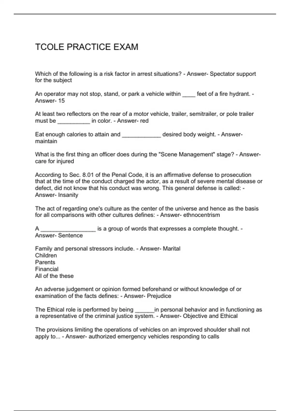 Which of the following is a risk factor in arrest situations? - Answer- Spectator support for the subject An operator may not stop, stand, or park a vehicle within ____ feet of a fire hydrant. - Answer- 15 At least two reflectors on the rear of a motor vehicle, trailer, semitrailer, or pole trailer must be __________ in color. - Answer- red Eat enough calories to attain and ____________ desired body weight. - Answer- maintain What is the first thing an officer does during the "Scene Management" stage? - Answer- care for injured According to Sec. 8.01 of the Penal Code, it is an affirmative defense to prosecution that at the time of the conduct charged the actor, as a result of severe mental disease or defect, did not know that his conduct was wrong. This general defense is called: - Answer- Insanity The act of regarding one's culture as the center of the universe and hence as the basis for all comparisons with other cultures defines: - Answer- ethnocentrism A _________________ is a group of words that expresses a complete thought. - Answer- Sentence Family and personal stressors include. - Answer- Marital Children Parents Financial All of the these An adverse judgement or opinion formed beforehand or without knowledge of or examination of the facts defines: - Answer- Prejudice The Ethical role is performed by being ______in personal behavior and in functioning as a representative of the criminal justice system. - Answer- Objective and Ethical The provisions limiting the operations of vehicles on an improved shoulder shall not apply to... - Answer- authorized emergency vehicles responding to calls