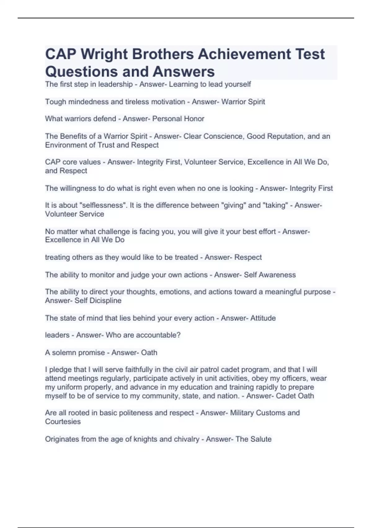 CAP Wright Brothers Achievement Test Questions and Answers