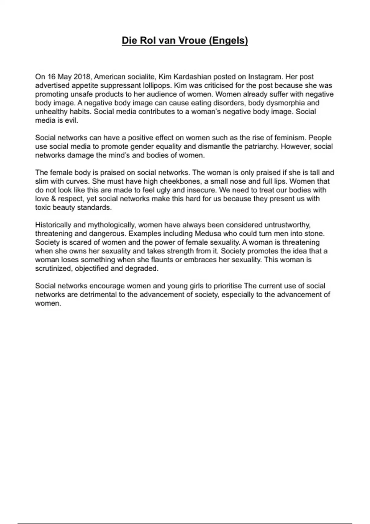 An Afrikaans speech with the English translation attached. The topic is the role of women in today’s society and explores how social media negatively impacts women. It is very easy to follow and you can refer to the English translation in order to ensure that you know what you are saying. A very powerful speech that will impress your teacher.