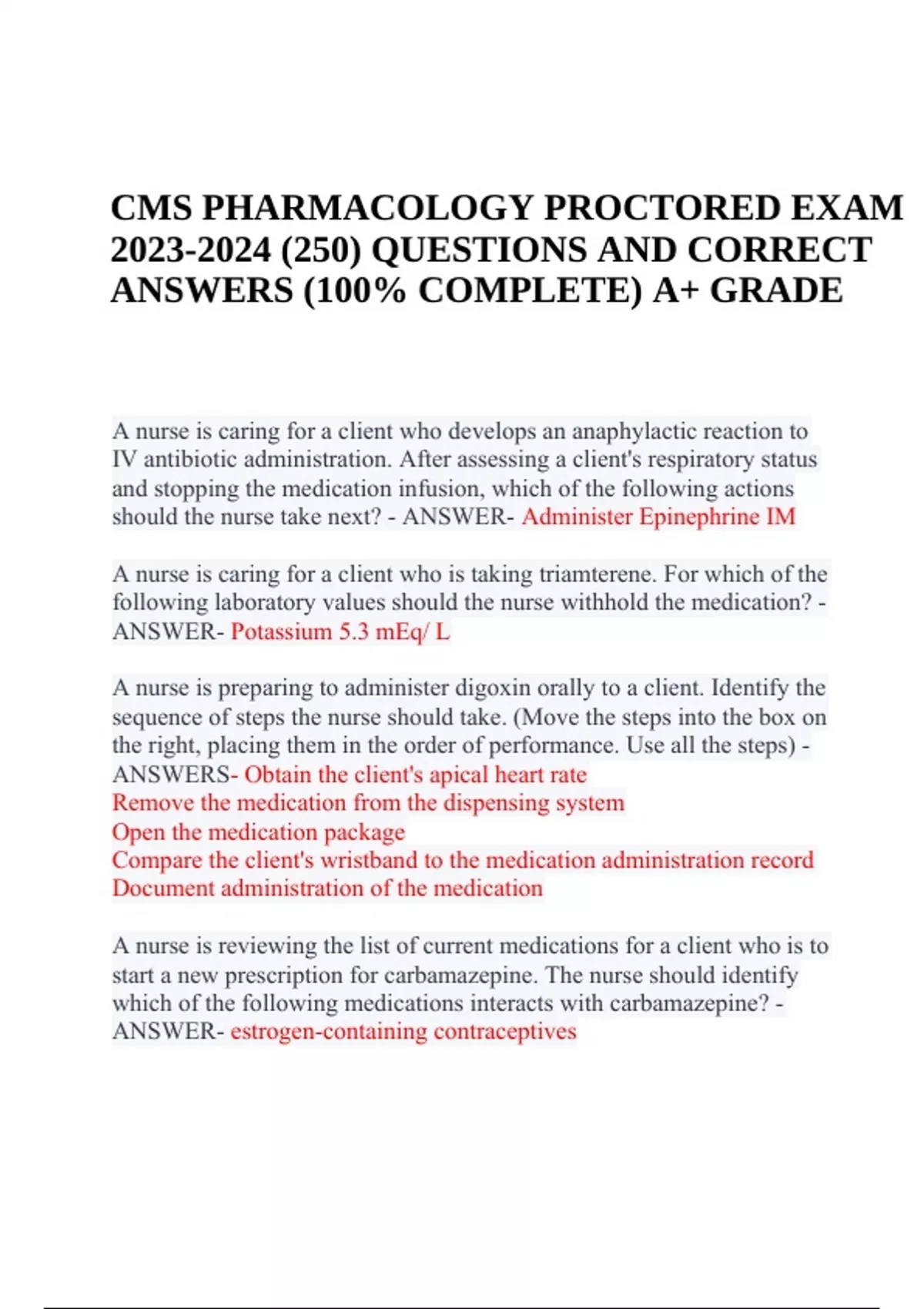 CMS PHARMACOLOGY PROCTORED EXAM (250) QUESTIONS AND CORRECT ANSWERS (100% COMPLETE) A+ GRADE. A nurse is caring for a client who develops an anaphylactic reaction to IV antibiotic administration. After assessing a client's respiratory status and stopping the medication infusion, which of the following actions should the nurse take next? - ANSWER- Administer Epinephrine IM A nurse is caring for a client who is taking triamterene. For which of the following laboratory values should the nurse withhold the medication? - ANSWER- Potassium 5.3 mEq/ L A nurse is preparing to administer digoxin orally to a client. Identify the sequence of steps the nurse should take. (Move the steps into the box on the right, placing them in the order of performance. Use all the steps) - ANSWERS- Obtain the client's apical heart rate Remove the medication from the dispensing system Open the medication package Compare the client's wristband to the medication administration record Document administration of the medication A nurse is reviewing the list of current medications for a client who is to start a new prescription for carbamazepine. The nurse should identify which of the following medications interacts with carbamazepine? - ANSWER- estrogen-containing contraceptives CMS PHARMACOLOGY PROCTORED EXAM (250) QUESTIONS AND CORRECT ANSWERS (100% COMPLETE) A+ GRADE A nurse is providing teaching to a client who has a new prescription for clozapine. Which of the following statements should the nurse include in the teaching? - ANSWER- Notify your provider if you develop a fever while taking this medication" you should have your WBC monitor every week A nurse is reviewing the medication list of a client who has erectile dysfunction and is requesting for prescription for sildenafil. the nurse should identify which of the following medications is a contraindication for receiving medication? - ANSWER- nitroglycerin A nurse in a medical surgical unit is preparing to administer an influenza vaccine to a client. The client tells the nurse I no longer want this vaccine. Which of the following responses should the nurse make? - ANSWER- the influenza vaccine this strongly and coverage but I understand you would like to decline right now A nurse is discussing adverse reactions to pain medications in older adults clients with a newly licensed nurse. Which of the following findings should the nurse include as risk factors for an adverse drug reaction? select all that applies - ANSWER- multiple health problems decrease percentage of body fat decreased renal function A nurse is reviewing a client's medical record before administering acetaminophen 650 mg by mouth every 6 hours. Which of the following findings indicate a need for the nurse to notify the provider? - ANSWER- history of alcohol use disorder a nurse is caring for a client who has hyponatremia and is receiving an infusion of a prescribed hypertonic solution. Which of the following findings should indicate to the nurse that the treatment is effective? - ANSWER- improve cognition A nurse is reviewing the laboratory results of a client who is receiving genital medicine for Staphylococcus. Which of the following findings should the nurse report to there immediately? - ANSWER- fasting blood glucose 130 mg A nurse is reviewing the laboratory results of a client who is receiving Heparin by continuous IV infusion. Which of the following Results indicates the nurse should decrease the infusion rate? - ANSWER- aPTT 90 sec The nurse is caring for a client who has diabetes mellitus and is taking Pioglitazone. The nurse should plan to monitor the client for which of the following adverse effects? - ANSWER- orthostatic hypotension A nurse is caring for a client who is receiving ceftriaxone intravenously. Which of the following manifestations should the nurse identify as an allergic reaction? - ANSWER- Hypotension A nurse is reviewing the laboratory results of a client who received a dose of sodium polystyrene sulfonate. Which of the following findings should a nurse identify as an indication that the medication has been effective? - ANSWER- calcium 8 mg- under normal range potassium 4.6 meq- in normal range A nurse is caring for a client who has heart failure and is taking hydrochlorothiazide. The nurse should monitor the client for which of the following manifestations has an adverse effect of the medication? - ANSWER- hypokalemia A nurse recently administered filgrastim intravenously to a client who has cancer and is receiving cytotoxic chemotherapy. For which of the following data, discovered after the medication was administered, should the nurse file an incident report? - ANSWER- The medication vial sat at room temperature for 2 hours before it was administered. A nurse in a provider's office is assessing a client who has hypothyroidism and has been taking levothyroxine for 2 months. Which of the following statements by the client indicate a therapeutic response to the medication? - ANSWER- I have noticed I'm not as cold as I used to be a nurse is receiving the laboratory results of a client who has rheumatoid arthritis and a prescription for cyclosporine. The nurse should report which of the following laboratory results of the provider? - ANSWERcreatinine 2.8 mg A nurse is teaching a newly-licensed nurse about expired medication. Which of the following instructions should the nurse include in the teaching? - ANSWER- return the medication to the pharmacy a nurse is administering naloxone to a client who has developed an adverse reaction to Morphine. The nurse should identify which of the following findings as a therapeutic effect of naloxone? - ANSWERincreased respiratory rate a nurse is preparing to administer Heparin subcutaneously to a client. Which of the following should the nurse plan to minimize bleeding following the injection? - ANSWER- grasp skin between thumb and forefinger throughout the injection A nurse is caring for an older adult client who is taking Prednisone for