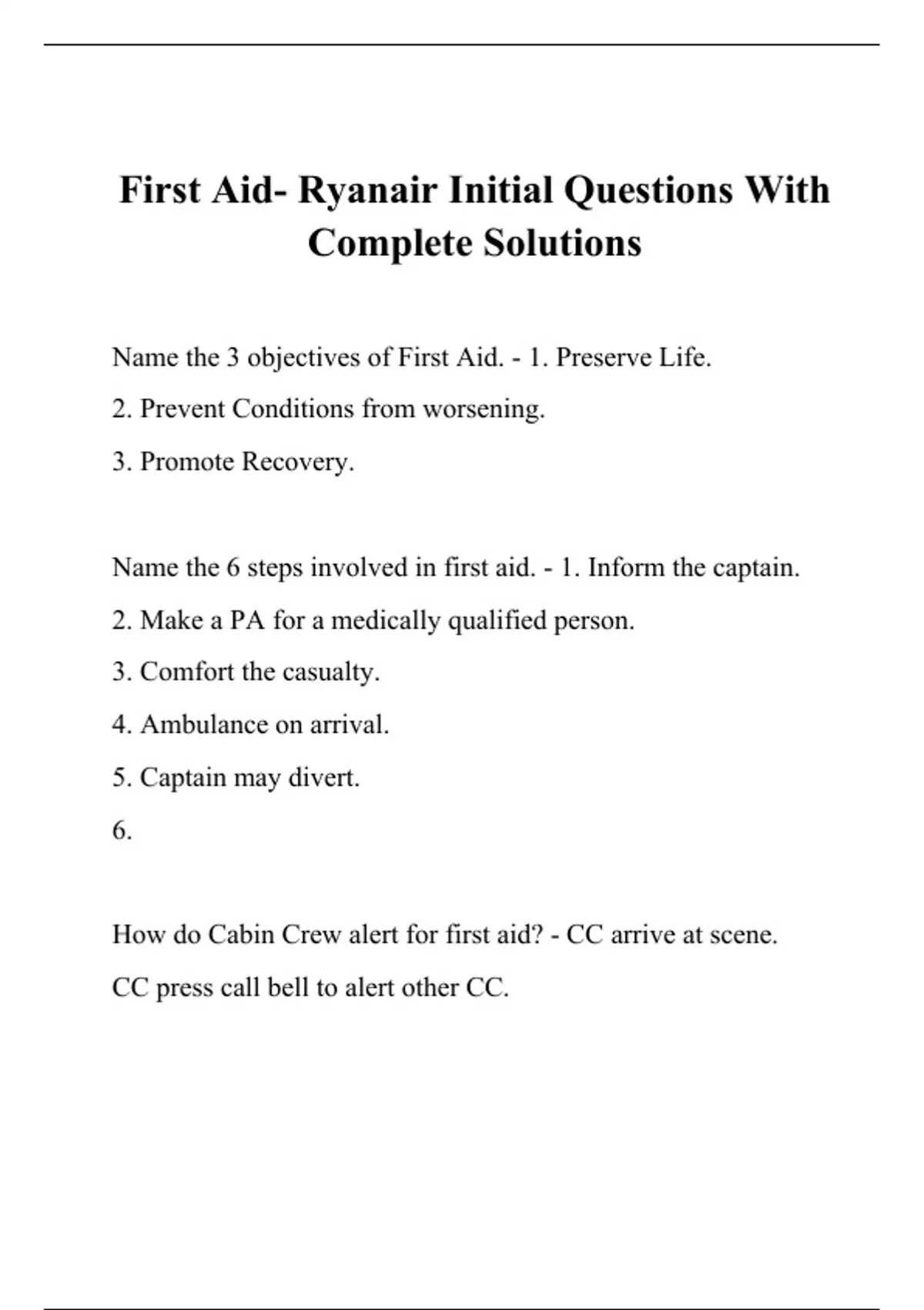 First Aid- Ryanair Initial Questions With Complete Solutions