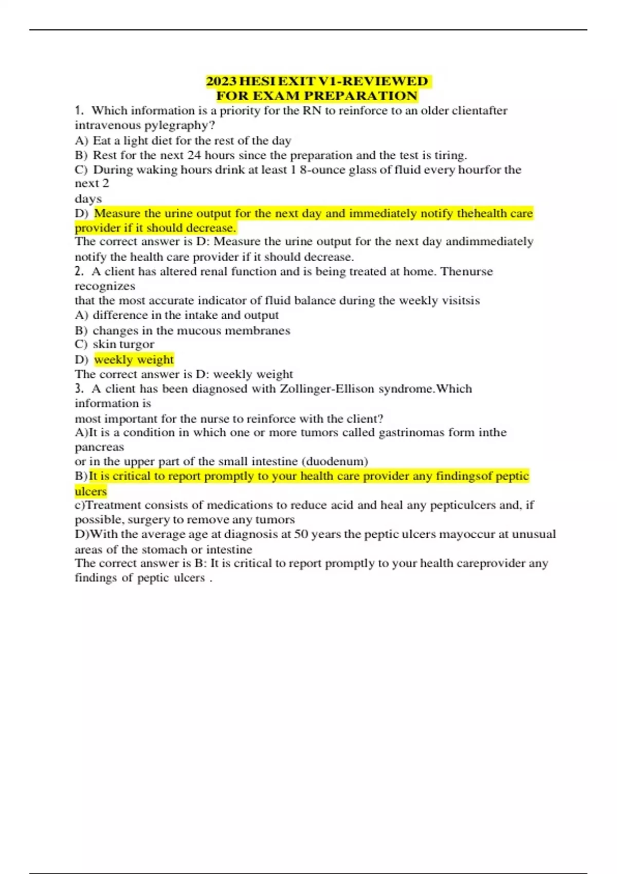 1. Which information is a priority for the RN to reinforce to an older client after intravenous pylegraphy? A) Eat a light diet for the rest of the day B) Rest for the next 24 hours since the preparation and the test is tiring. C) During waking hours drink at least 1 8-ounce glass of fluid every hour for the next 2 days D) Measure the urine output for the next day and immediately notify the health care provider if it should decrease. The correct answer is D: Measure the urine output for the next day and immediately notify the health care provider if it should decrease. 2. A client has altered renal function and is being treated at home. The nurse recognizes that the most accurate indicator of fluid balance during the weekly visits is A) difference in the intake and output B) changes in the mucous membranes C) skin turgor D) weekly weight The correct answer is D: weekly weight 3. A client has been diagnosed with Zollinger-Ellison syndrome.Which information is most important for the nurse to reinforce with the client? A) It is a condition in which one or more tumors called gastrinomas form in the pancreas or in the upper part of the small intestine (duodenum) B) It is critical to report promptly to your health care provider any findings of peptic ulcers c)Treatment consists of medications to reduce acid and heal any peptic ulcers and, if possible, surgery to remove any tumors D)With the average age at diagnosis at 50 years the peptic ulcers may occur at unusual areas of the stomach or intestine The correct answer is B: It is critical to report promptly to your health care provider any findings of peptic ulcers . 4. A primigravida in the third trimester is hospitalized for preeclampsia. The nurse determines that the client’s blood pressure is increasing. Which action should the nurse take first? A) Check the protein level in urine B) Have the client turn to the left side C) Take the temperature D) Monitor the urine output The correct answer is B: Have the client turn to the left side 5. The nurse is caring for a client in atrial fibrillation. The atrial heart rate is 250 and the ventricular rate is controlled at 75. Which of the following findings is cause for the most concern? A) Diminished bowel sounds B) Loss of appetite C) A cold, pale lower leg D) Tachypnea The correct answer is C: A cold, pale lower leg 6. The client with infective endocarditis must be assessed frequently by the home health nurse. Which finding suggests that antibiotic therapy is not effective, and must be reported by the nurse immediately to the healthcare provider? A) Nausea and vomiting B) Fever of 103 degrees Fahrenheit (39.5 degrees Celsius) C) Diffuse macular rash D) Muscle tenderness The correct answer is B: Fever of 103 degrees F (39.5 degrees C) 7. A client who had a vasectomy is in the post recovery unit at an outpatient clinic. Which of these points is most important to be reinforced by the nurse? A) Until the health care provider has determined that your ejaculate doesn't contain sperm, continue to use another form of contraception. B) This procedure doesn't impede the production of male hormones or the production of sperm in the testicles. The sperm can no longer enter your semen and no sperm are in your ejaculate. C) After your vasectomy, strenuous activity needs to be avoided for at least 48 hours. If your work doesn't involve hard physical labor, you can return to your job as soon as you feel up to it. The stitches generally dissolve in seven to ten days. D) The health care provider at this clinic recommends rest, ice, an athletic supporter or over-the-counter pain medication to relieve any discomfort. The correct answer is A: Until the health care provider has determined that your ejaculate doesn't contain sperm, continue to use another form of contraception. 8. A client who is to have antineoplastic chemotherapy tells the nurses of a fear of being sick all the time and wishes to try acupuncture. Which of these beliefs stated by the client would be incorrect about acupuncture? A) Some needles go as deep as 3 inches, depending on where they're placed in the body and what the treatment is for. The needles usually are left in for 15 to 30 minutes. B) In traditional Chinese medicine, imbalances in the basic energetic flow of life — known as qi or chi — are thought to cause illness. * C) The flow of life is believed to flow through major pathways or nerve clusters in your body. D) By inserting extremely fine needles into some of the over 400 acupuncture points in various combinations it is believed that energy flow will rebalance to allow the body's natural healing mechanisms to take over. The correct answer is C: The flow of life is believed to flow through major pathways or nerve clusters in your body. 9. The nurse is discussing with a group of students the disease Kawasaki. What statement made by a student about Kawasaki disease is incorrect? A)It also called mucocutaneous lymph node syndrome because it affects the mucous membranes (inside the mouth, throat and nose), skin and lymph nodes. B)In the second phase of the disease, findings include peeling of the skin on the hands and feet with joint and abdominal pain C) Kawasaki disease occurs most often in boys, children younger than age 5 and children of Hispanic descent D) Initially findings are a sudden high fever, usually above 104 degrees Fahrenheit, which lasts 1 to2 weeks The correct answer is C: Kawasaki disease occurs most often in boys, children younger than age 5 and children of Hispanic descent 10. A client has viral pneumonia affecting 2/3 of the right lung. What would be the best position to teach the client to lie in every other hour during first 12 hours after admission? A) Side-lying on the left with the head elevated 10 degrees B) Side-lying on the left with the head elevated 35 degrees C) Side-lying on the right wil the head elevated 10 degrees D) Side-lying on the right with the head elevated 35 degrees The correct answer is A: S