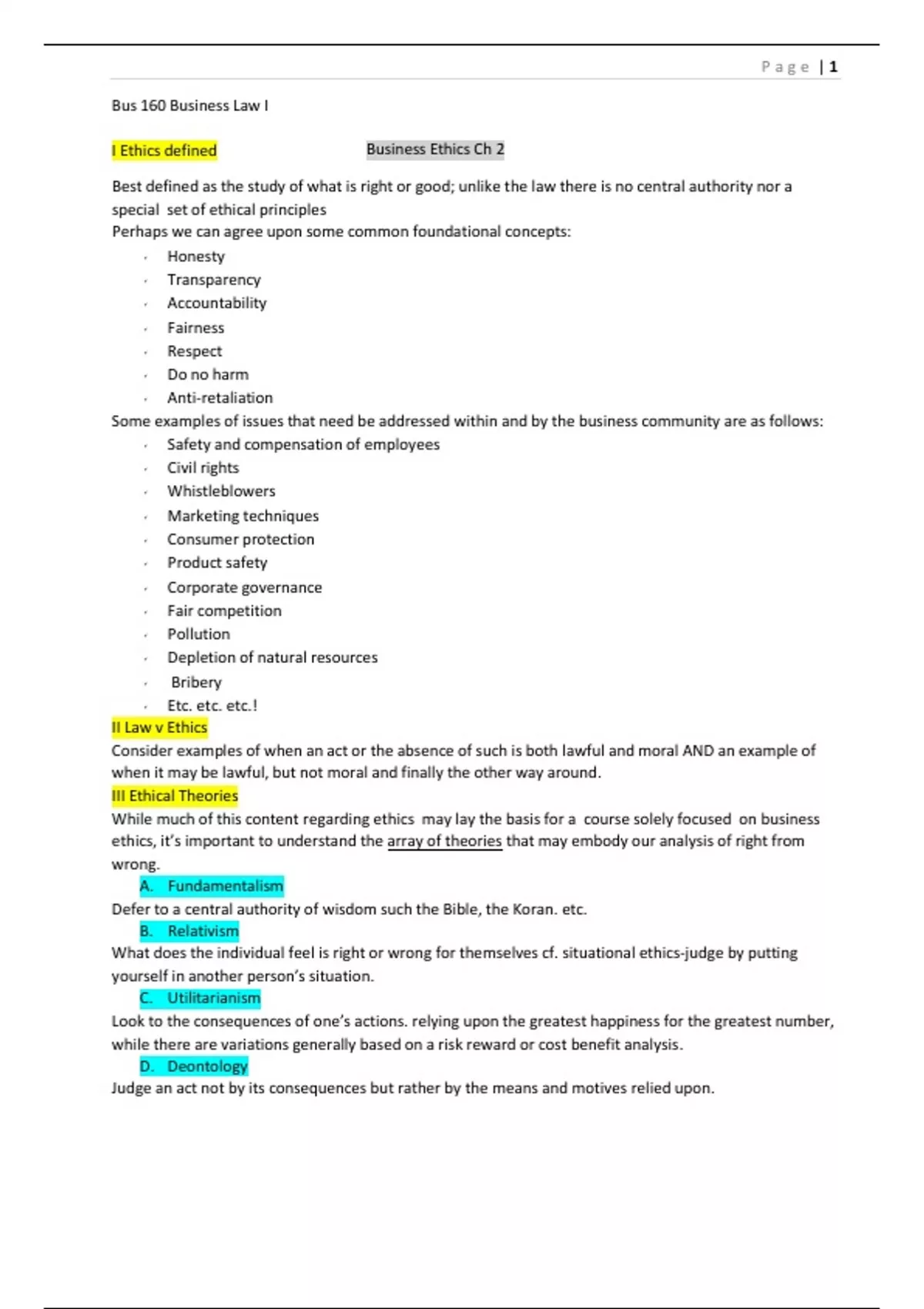 Definition of ethics, Law v Ethics, Ethical Theories, Ethical Standards in Business, Arguments regarding social responsibility,
