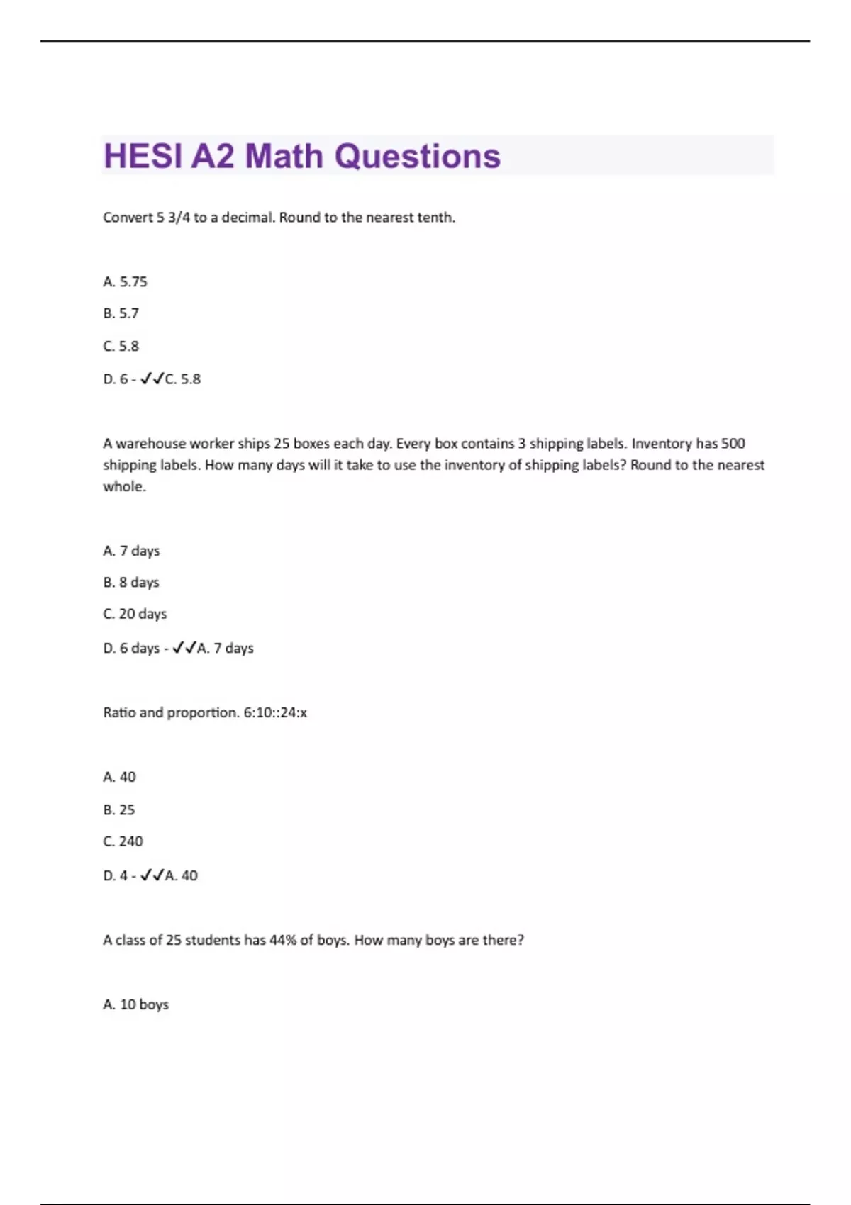 HESI A2 Math Questions Convert 5 3/4 to a decimal. Round to the nearest tenth. A. 5.75 B. 5.7 C. 5.8 D. 6 - C. 5.8 A warehouse worker ships 25 boxes each day. Every box contains 3 shipping labels. Inventory has 500 shipping labels. How many days will it take to use the inventory of shipping labels? Round to the nearest whole. A. 7 days B. 8 days C. 20 days D. 6 days - A. 7 days Ratio and proportion. 6:10::24:x A. 40 B. 25 C. 240 D. 4 - A. 40 A class of 25 students has 44% of boys. How many boys are there? A. 10 boysB. 11 boys C. 9 boys D. 13 boys - B. 11 boys 3.44 divided by 0.6 A. 0.57 B. 5.73 C. 11.41 D. 2.33 - B. 5.73 Solve if x=11. x+44/2x A. 55/22 B. 33 C. c D. 13 - D. 13 4 & 7/8 divided by 1 & 1/6 A. 4 & 5/28 B. 4 & 6/8 C. 4 & 7/8 D. 5 & 8/14 - A. 4 & 5/28 Add. 6 & 3/4 + 8 & 1/6 A. 35/6B. 14 & 2/5 C. 14 & 11/12 D. 12 & 3/24 - C. 14 & 11/12 Solve for x. x/250=3/500 A. 1.5 B. 2.5 C. 1500 D. 25.5 - A. 1.5 A dice is rolled. What is the probability of getting 5? A. 20% B. 50% C. 16.6% D. 83.3% - C. 16.6% Convert to metric: 7 gram = x mg A. 700mg B. 0.007 mg C. 7,000 mg D. 0.0007 mg - C. 7,000 mg Sally eats 3/5 of her lunch. John eats 75%. Who ate more? A. JohnB. Sally - A. John Add 1/4 + 3/8. A. 4/12 B. 5/8 C. 1/2 D. 1/3 - B. 5/8 How many ounces in 8 & 1/4 pints? A. 136 oz B. 128 oz C. 132 oz D. 2.25 oz - C. 132 oz Subtract 5/6 - 3/4. A. 2/24 B. 1/12 C. 1 D. 1/2 - B. 1/12 Add 2/3 + 1/6 + 2/5. A. 1 & 1/15 B. 2/5 C. 1/3D. 1 & 7/30 - D. 1 & 7/30 A farmers productions statistics finds that it takes 2 chickens to produce 6 eggs in 24 hours. How many chickens will be needed to produce 24 eggs in 24 hours? A. 12 chickens B. 4 chickens C. 3 chickens D. 8 chickens - D. 8 chickens Subtract 28 & 3/4 - 5 & 5/6. A. 22 B. 34 & 1/12 C. 23 & 1/2 D. 22 & 11/12 - D. 22 & 11/12 Add 7/8 + 9/10 + 6/5 as mixed. A. 3 & 39/40 B. 3 & 22/23 C. 22/23 D. 2 & 39/40 - D. 2 & 39/40 A mother changes her baby 6 times a day. How many diapers will be needed in a year? A. 2190 diapers B. 2100 diapers C. 2160 diapersD. 2140 diapers - A. 2190 diapers Subtract 2 & 5/8 - 7/8 and reduce. A. 1 & 5/8 B. 1 & 6/8 C. 1 & 3/4 D. 1 & 1/4 - C. 1 & 3/4 A dice is rolled, what's the probability of an odd number? A. 16.6% B. 33% C. 75% D. 50% - D. 50% 32 divided by 8/9. A. 4 & 1/9 B. 4 C. 36 D. 28 & 4/9 - C. 36 40.3 divided by 4.8. A. 0.084 B. 84 C. 0.84D. 8.4 - D. 8.4 Ratio and proportion 0.1:10::x:400 A. 5 B. 4 C. 50 D. 25 - B. 4 A cake provides 24 servings. How many cakes do you need for a class of 70 and staff of 3? A. 4 B. 2 C. 5 D. 3 - A. 4 A female ran a 24 mile course. Her first 6 miles she ran in 1 hour. The second set of 6 miles in 1.2 hours. The third set of 6 miles in 1.5 hours. The fourth set of 6 miles in 1.6 hours. How did long did it take her to complete the course? A. 5 hours B. 5.3 hours C. 4 hours D. 5.4 hours - B. 5.3 hours What is 54% of $789.56 A. $526.38 B. $426.37C. $363.20 D. $426.36 - D. $426.36 1/9 divided by 2/3 A. 1/6 B. 2/3 C. 3/18 D. 1/3 - A. 1/6 How many liters in 300 milliliters? A. 0.03 liters B. 3 liters C. 0.3 liters D. 3.30 liters - C. 0.3 liters Ratio and proportion 18:x::10:300 A. 16.6 B. 180 C. 30 D. 540 - D. 540 Subtract 12 - 7 & 4/5. A. 4 & 4/5 B. 5 & 4/5C. 4 & 1/5 D. 5 & 1/5 - C. 4 & 1/5 Find x. 120:x::40:0.5 A. 60 B. 0.167 C. 1.5 D. 16 - C. 1.5 5 & 3/4 divided by 1/2 reduce. A. 5 & 1/2 B. 2 & 3/8 C. 18 D. 11 & 1/2 - D. 11 & 1/2 Ratio and proportion 1.2:x::14:42 A. 2.4 B. 0.6 C. 1.2 D. 3.6 - D. 3.6 Find x 40:5=60:x A. 12 B. 7.5C. 1.5 D. 8 - B. 7.5 Ratio and proportion 15:2000::x:200 A. 7.5 B. 0.15 C. 7,777 D. 1.5 - D. 1.5 If quotient is 4, and 12 is the dividend, what is the divisor? A. x B. 12 C. 4 D. 3 - D. 3 Subtract 7 & 7/10 - 3 & 4/5 A. 11 & 5/10 B. 4 & 3/5 C. 3 & 9/10 D. 4 & 1/10 - C. 3 & 9/10 Change 0.26 to a fraction A. 13/50 B. 26/100C. 7/8 D. 2 & 6/10 - A. 13/50 Multiply 4/9 x 1 & 4/5 x 2/5 A. 1 & 32/45 B. 7/16 C. 8/25 D. 1 & 10/19 - C. 8/25 Add 2/3 + 4/9 A. 8/15 B. 9/9 = 1 C. 10/9 = 1 & 1/9 D. 6/12 = 1/2 - C. 10/9 = 1 & 1/9 Compare 0.045 is _____ to 0.054 A. Greater than B. Less than C. Less than or equal D. Equal - B. Less than Change 0.025 to a ratio A. 400:1 B. 4:1C. 1:40 - C. 1:40 Change 0.004 to a ratio A. 1:250 B. 1:125 C. 4/1000 D. 2/500 - A. 1:250 Largest? A. 3/8 B. 3/7 C. 3/9 D. 3/6 - D. 3/6 Subtract 3/5 - 2/7 A. 1/2 B. - 1/2 C. 3/35 D. 11/35 - D. 11/35 Covert 1/5 to a decimal. A. 1.5 B. 0.5 C. 0.15D. 0.2 - D. 0.2 Largest? A. 0.667 B. 0.68 C. 0.6 D. 0.0688 - B. 0.68 A man is reading. He reads two chapters a day. How long will it take if there are 6 pages per chapter and 798 pages total? A. 66 & 1/2 B. 399 C. 75 & 1/2 D. 133 - A. 66 & 1/2 0.9 divided 3 A. 0.9 B. 3 C. 0.3 - C. 0.3 Subtract 12.02 - 9.99 A. 2.03 B. 2.45 C. 2.13 D. 2.00 - A. 2.03Covert 2100 to standard A. 12pm B. 2 am C. 9 pm D. 2 pm - C. 9 pm A label states 1 mil contains 500 mg. How many mils if there are 1.5 grams? A. 9 B. 2 C. 3 D. 5 - C. 3 A mother is planning a birthday part. She will give each child 15 balloons. There are 50 balloons per packet. How many packets does the mother need if there will be 16 children? A. 17 B. 5 C. 6 D. 50 - B. 5