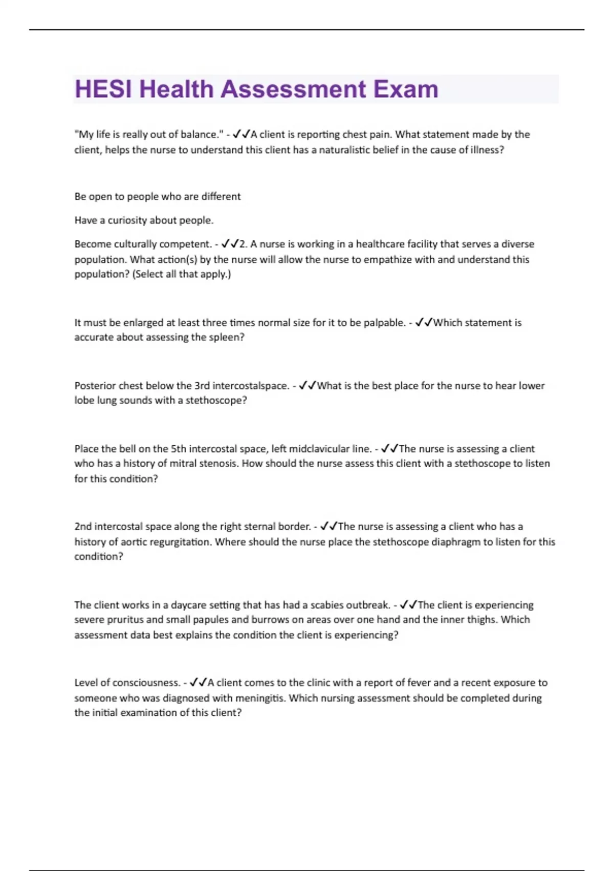 "My life is really out of balance." - A client is reporting chest pain. What statement made by the client, helps the nurse to understand this client has a naturalistic belief in the cause of illness? Be open to people who are different Have a curiosity about people. Become culturally competent. - 2. A nurse is working in a healthcare facility that serves a diverse population. What action(s) by the nurse will allow the nurse to empathize with and understand this population? (Select all that apply.) It must be enlarged at least three times normal size for it to be palpable. - Which statement is accurate about assessing the spleen? Posterior chest below the 3rd intercostalspace. - What is the best place for the nurse to hear lower lobe lung sounds with a stethoscope? Place the bell on the 5th intercostal space, left midclavicular line. - The nurse is assessing a client who has a history of mitral stenosis. How should the nurse assess this client with a stethoscope to listen for this condition? 2nd intercostal space along the right sternal border. - The nurse is assessing a client who has a history of aortic regurgitation. Where should the nurse place the stethoscope diaphragm to listen for this condition? The client works in a daycare setting that has had a scabies outbreak. - The client is experiencing severe pruritus and small papules and burrows on areas over one hand and the inner thighs. Which assessment data best explains the condition the client is experiencing? Level of consciousness. - A client comes to the clinic with a report of fever and a recent exposure to someone who was diagnosed with meningitis. Which nursing assessment should be completed during the initial examination of this client?