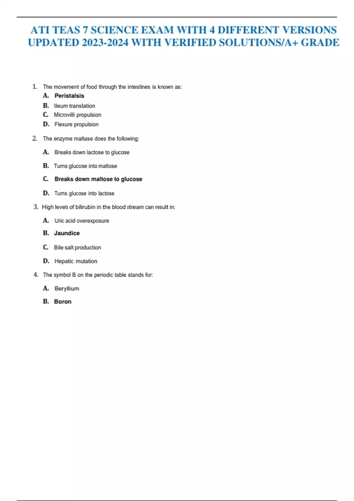 ATI TEAS 7 SCIENCE EXAM WITH 4 DIFFERENT VERSIONS UPDATED WITH VERIFIED SOLUTIONS/A+ GRADE 1. The movement of food through the intestines is known as: A. Peristalsis B. Ileum translation C. Microvilli propulsion D. Flexure propulsion 2. The enzyme maltase does the following: A. Breaks down lactose to glucose B. Turns glucose into maltose C. Breaks down maltose to glucose D. Turns glucose into lactose 3. High levels of bilirubin in the blood stream can result in: A. Uric acid overexposure B. Jaundice C. Bile salt production D. Hepatic mutation 4. The symbol B on the periodic table stands for: A. Beryllium B. Boron C. Barium D. Berkelium 5. The symbol Mn on the periodic table stands for: A. Magnesium B. Molybdenu