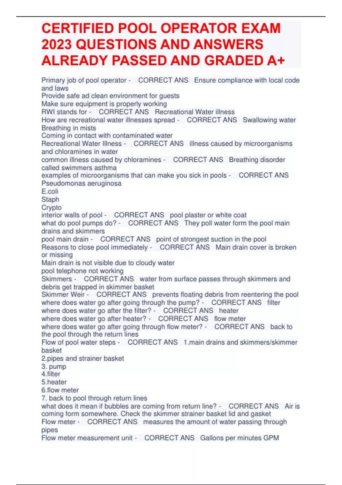 CERTIFIED POOL OPERATOR EXAM 2023 QUESTIONS AND ANSWERS ALREADY PASSED AND GRADED A+