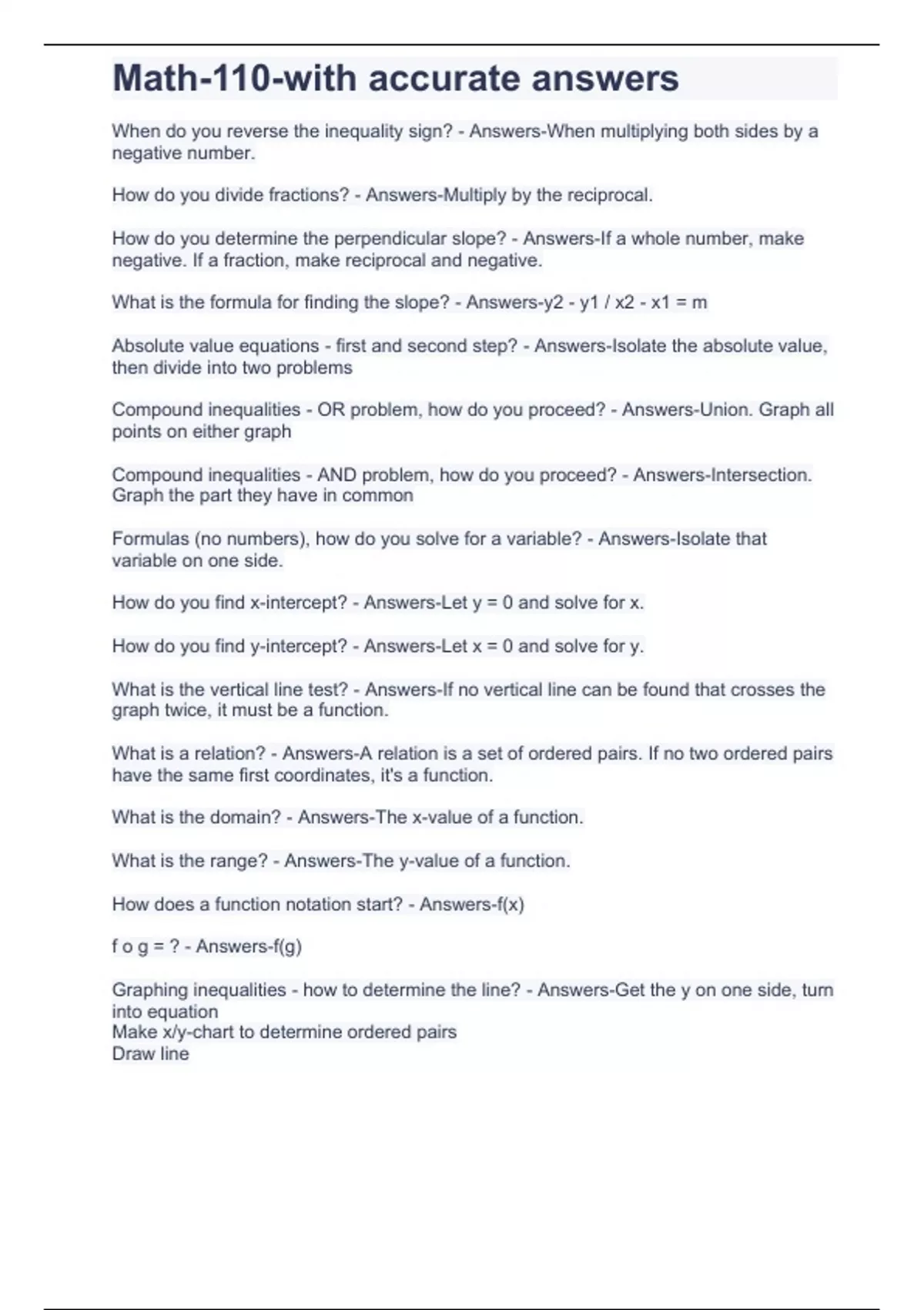 Absolute value equations - absolute value is LARGER than the positive number, AND/OR? - Answers-Or - divide into two problems Complementary angles add up to.. - Answers-90 Supplementary angles add up to.. - Answers-180 x^r multiplied by x^s - Answers-x^r+s (x^r)^s - Answers-x^r multiplied by s (a x b)^r - Answers-a^r multiplied by b^r 3^-2 - Answers-1/3^2 = 9 1/3^-2 - Answers-3^2/1 x^r / x^s - Answers-x^r-s 20 / 0 - Answers-undefined Same sign, positive or negative? - Answers-Positive