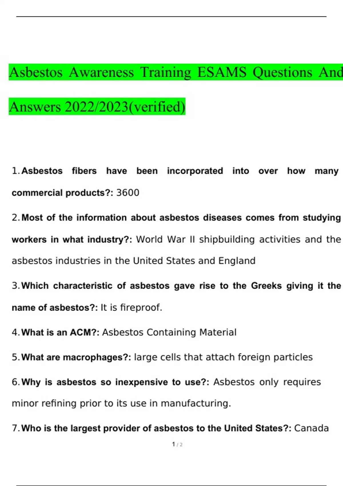 Asbestos Awareness Training ESAMS Questions and Answers 2023 with complete solution