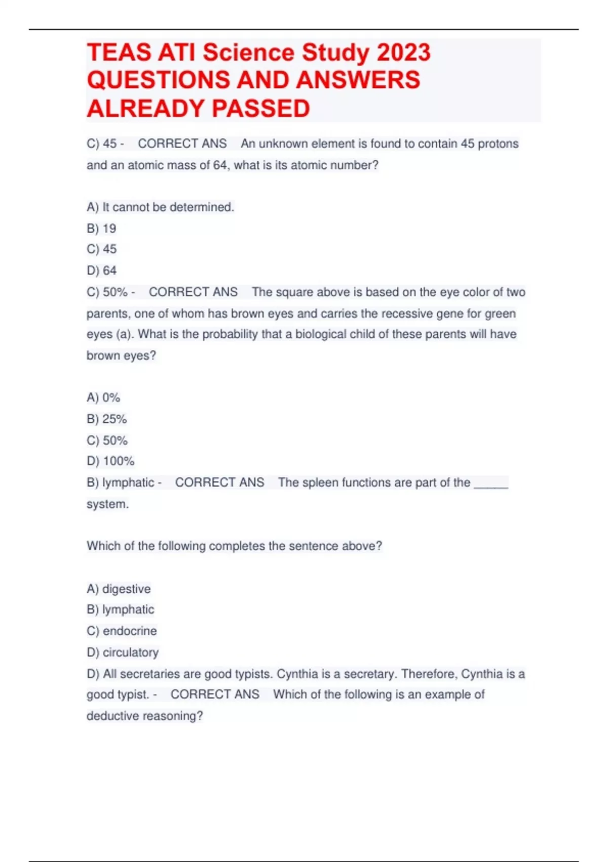 C) 45 - CORRECT ANS An unknown element is found to contain 45 protons and an atomic mass of 64, what is its atomic number? A) It cannot be determined. B) 19 C) 45 D) 64 C) 50% - CORRECT ANS The square above is based on the eye color of two parents, one of whom has brown eyes and carries the recessive gene for green eyes (a). What is the probability that a biological child of these parents will have brown eyes? A) 0% B) 25% C) 50% D) 100% B) lymphatic - CORRECT ANS The spleen functions are part of the _____ system. Which of the following completes the sentence above? A) digestive B) lymphatic C) endocrine D) circulatory D) All secretaries are good typists. Cynthia is a secretary. Therefore, Cynthia is a good typist. - CORRECT ANS Which of the following is an example of deductive reasoning? A) Only 21% of a town's population have expressed a desire to ban all cars. Therefore, the new proposition banning cars in the state is not likely to pass B) People who brush their teeth regularly have fewer instances of heart disease. Therefore, good dentistry can prevent heart attacks. C) All soccer players who play professionally can kick well. Therefore, any future soccer player who is recruited to play professionally will be able to kick well. D) All secretaries are good typists. Cynthia is a secretary. Therefore, Cynthia is a good typist. B) whiplash - CORRECT ANS Which of the following is a possible cause of herniation of discs? A) hepatitis B) whiplash C) plantar fasciitis D) ulcer C) It regulates involuntary activity in the heart, stomach, lungs, and intestines. - CORRECT ANS Which of the following is a characteristic of the autonomic nervous system? A) It regulates the voluntary control of body movements through the skeletal muscles. B) It is the part of the nervous system consisting of the brain and spinal cord. C) It regulates involuntary activity in the heart, stomach, lungs, and intestines. D) It is thought to be the center of intelligence. A) Carbon dioxide and water. - CORRECT ANS During photosynthesis, which two compounds are combined to create the output of glucose and oxygen? A) Carbon dioxide and water. B) Carbon dioxide and bicarbonate. C) Bicarbonate and water. D) Carbon dioxide and multiple alkaline substances B) It is a type of amphibian. - CORRECT ANS Which of the following is true about the frog? A) It is a member of the salamandridae family. B) It is a type of amphibian. C) It is a non-vertebrate. D) It is closer to most tetrapods than to most newts. D) All amphibians are vertebrates, but not all vertebrates are amphibians. - CORRECT ANS Which statement can be inferred about amphibians? A) All amphibians are salamandridae, but not all salamandridae are amphibians. B) Some amphibians are vertebrates, but not all amphibians are vertebrates. C) Some salamandridae are amphibians, but not all amphibians are tetrapods. D) All amphibians are vertebrates, but not all vertebrates are amphibians. A) determining outcomes for potential infection - CORRECT ANS What would this diagram be useful for? A) determining outcomes for potential infection B) diagnosing an infectious disease C) controlling the spread of disease in undeveloped countries D) training nurses to detect early onset symptoms of disease C) hydrogen - CORRECT ANS What type of bond between the complementary bases of DNA stabilizes the double helix structure? A) covalent B) ionoc C) hydrogen D) nuclear B) neutrons, protons - CORRECT ANS Which of the following subatomic particles are found inside of an atom's nucleus? A) electrons, neutrons, protons B) neutrons, protons C) electrons, protons D) electrons D) Tertiary consumers acquire less energy than primary consumers. - CORRECT ANS Which of the following statements is true regarding trophic levels? A) Tertiary consumers acquire more energy content than secondary consumers. B) Producers acquire less energy than primary consumers. C) Secondary consumers acquire more energy than primary consumers. D) Tertiary consumers acquire less energ