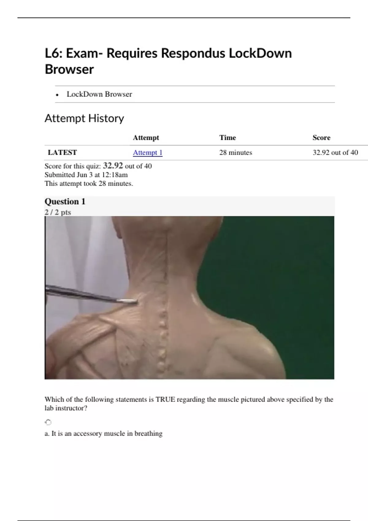 Which of the following statements is TRUE regarding the muscle pictured above specified by the lab instructor? a. It is an accessory muscle in breathing b. It elevates the scapula c. It protracts the scapula d. It is innervated by the accessory nerve e. a. and. c. are true statements Correct! f. b. and d. are true statements Question 2 2 / 2 pts Identify the muscle in the picture above, specified by the lab instructor, and list its actions. Your Answer: Latissimus Dorsi Actions: Extends the shoulders Moves the humerus and adducts medially Latissimus Dorsi; adducts and medially rotates the humerus, and extends the shoulder. Question 3 2 / 2 pts Which of the following statements is TRUE regarding the middle portion of the muscle pictured (highlighted in blue and specified by the arrow)? a. It is innervated by the axillary nerve b. It abducts the humerus c. It flexes the humerus d. It extends the humerus Correct! e. a. and b. are true statements f. a. and c. are true statements g. a. and d. are true statements