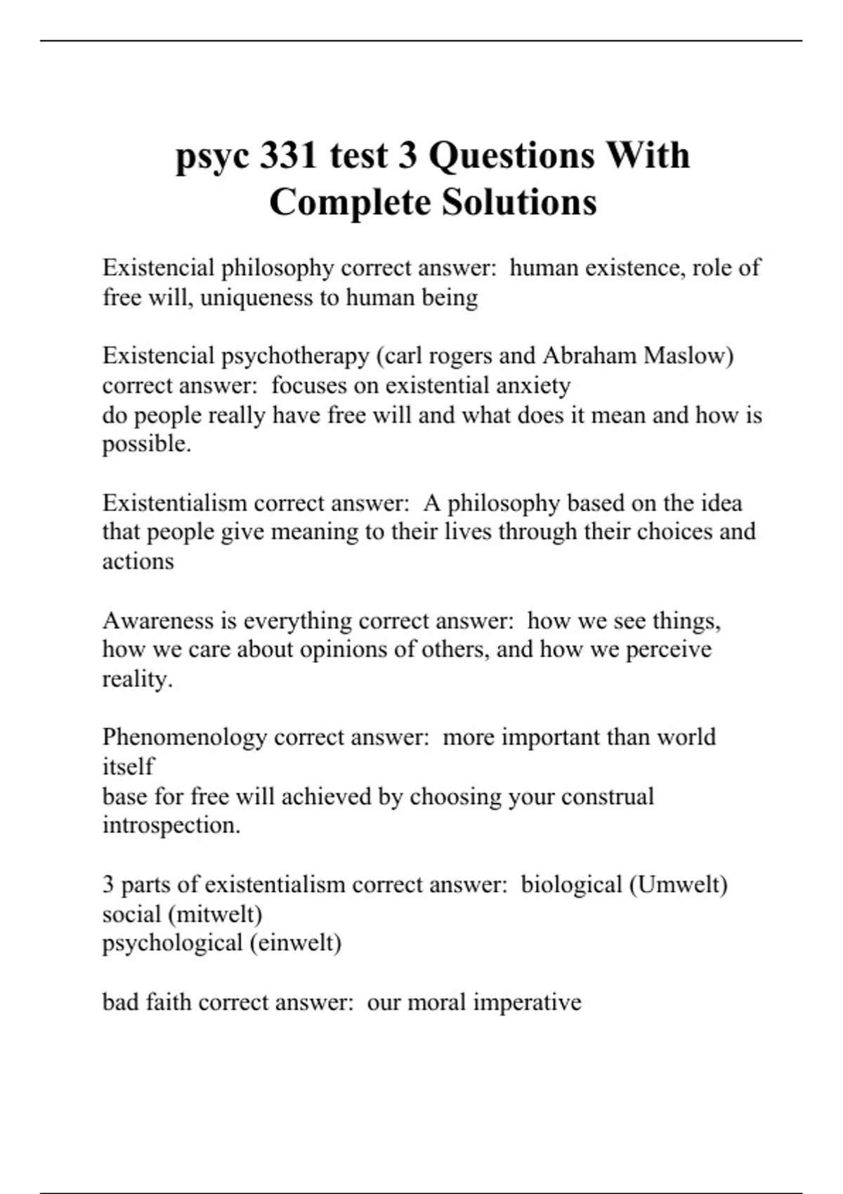 Existencial philosophy correct answer: human existence, role of free will, uniqueness to human being Existencial psychotherapy (carl rogers and Abraham Maslow) correct answer: focuses on existential anxiety do people really have free will and what does it mean and how is possible. Existentialism correct answer: A philosophy based on the idea that people give meaning to their lives through their choices and actions Awareness is everything correct answer: how we see things, how we care about opinions of others, and how we perceive reality. Phenomenology correct answer: more important than world itself base for free will achieved by choosing your construal introspection. 3 parts of existentialism correct answer: biological (Umwelt) social (mitwelt) psychological (einwelt) bad faith correct answer: our moral imperative