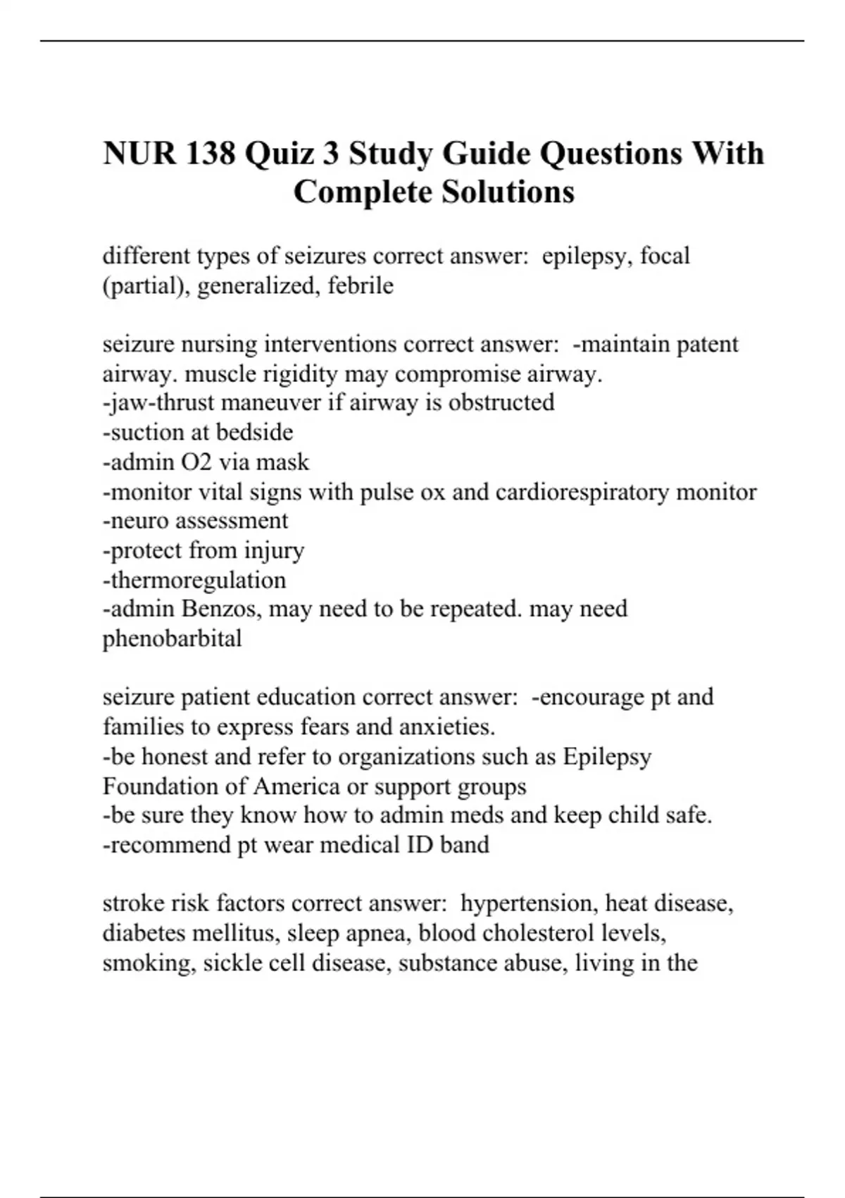 NUR 138 Quiz 3 Study Guide Questions With Complete Solutions
