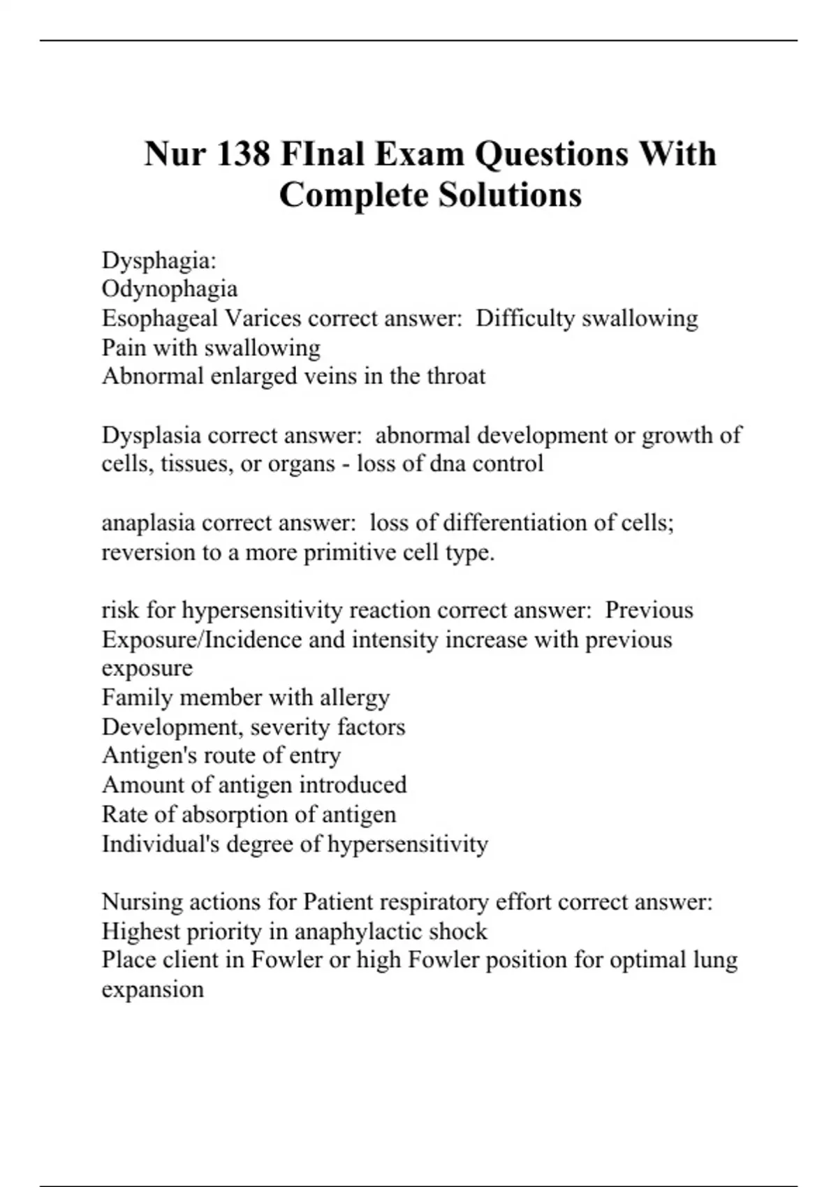 Dysphagia: Odynophagia Esophageal Varices correct answer: Difficulty swallowing Pain with swallowing Abnormal enlarged veins in the throat Dysplasia correct answer: abnormal development or growth of cells, tissues, or organs - loss of dna control anaplasia correct answer: loss of differentiation of cells; reversion to a more primitive cell type. risk for hypersensitivity reaction correct answer: Previous Exposure/Incidence and intensity increase with previous exposure Family member with allergy Development, severity factors Antigen's route of entry Amount of antigen introduced Rate of absorption of antigen Individual's degree of hypersensitivity Nursing actions for Patient respiratory effort correct answer: Highest priority in anaphylactic shock Place client in Fowler or high Fowler position for optimal lung expansion For mild to moderate reactions