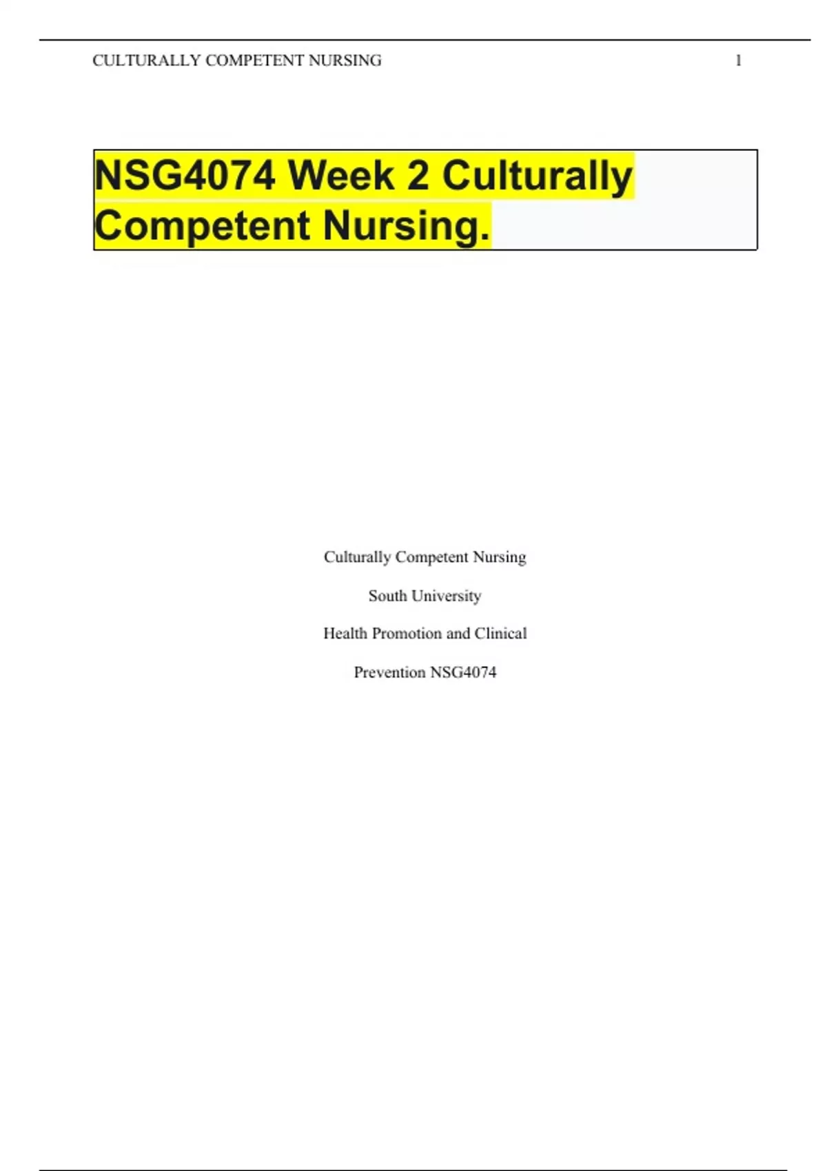 NSG4074 Week 2 Culturally Competent Nursing.