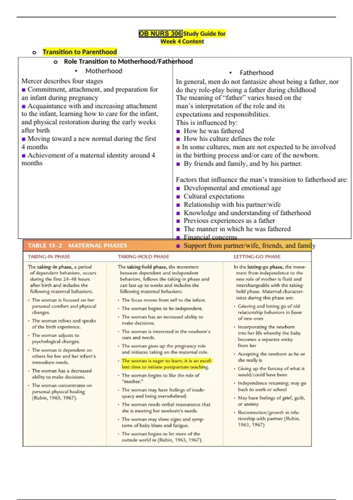 OB NURS 306 Study Guide for Week 4 Content o Transition to Parenthood o Role Transition to Motherhood/Fatherhood ▪ Motherhood ▪ Fatherhood Mercer describes four stages ■ Commitment, attachment, and preparation for an infant during pregnancy ■ Acquaintance with and increasing attachment to the infant, learning how to care for the infant, and physical restoration during the early weeks after birth ■ Moving toward a new normal during the first 4 months ■ Achievement of a maternal identity around 4 months In general, men do not fantasize about being a father, nor do they role-play being a father during childhood The meaning of “father” varies based on the man’s interpretation of the role and its expectations and responsibilities. This is influenced by: ■ How he was fathered ■ How his culture defines the role ■ In some cultures, men are not expected to be involved in the birthing process and/or care of the newborn. ■ By friends and family, and by his partner. Factors that influence the man’s transition to