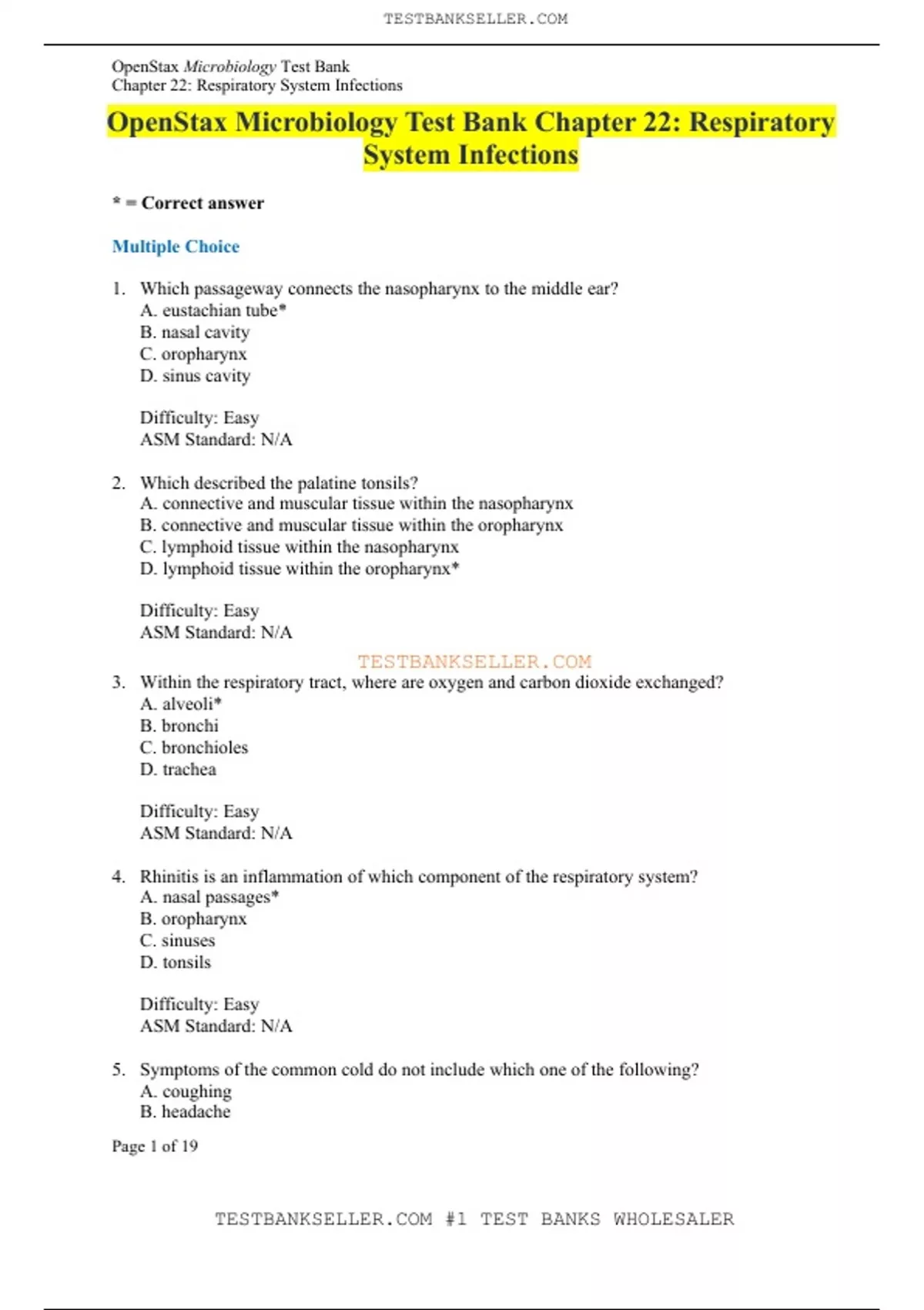 OpenStax Microbiology Test Bank Chapter 22: Respiratory System Infections * = Correct answer Multiple Choice 1. Which passageway connects the nasopharynx to the middle ear? A. eustachian tube* B. nasal cavity C. oropharynx D. sinus cavity Difficulty: Easy ASM Standard: N/A 2. Which described the palatine tonsils? A. connective and muscular tissue within the nasopharynx B. connective and muscular tissue within the oropharynx C. lymphoid tissue within the nasopharynx D. lymphoid tissue within the oropharynx* Difficulty: Easy ASM Standard: N/ATESTBANKSELLER.COM 3. Within the respiratory tract, where are oxygen and carbon dioxide exchanged? A. alveoli* B. bronchi C. bronchioles D. trachea Difficulty: Easy ASM Standard: N/A 4. Rhinitis is an inflammation of which component of the respiratory system? A. nasal passages* B. oropharynx C. sinuses D. tonsils Difficulty: Easy ASM Standard: N/A 5. Symptoms of the common cold do not include which one of the following? A. coughing B. headache C. high fever*