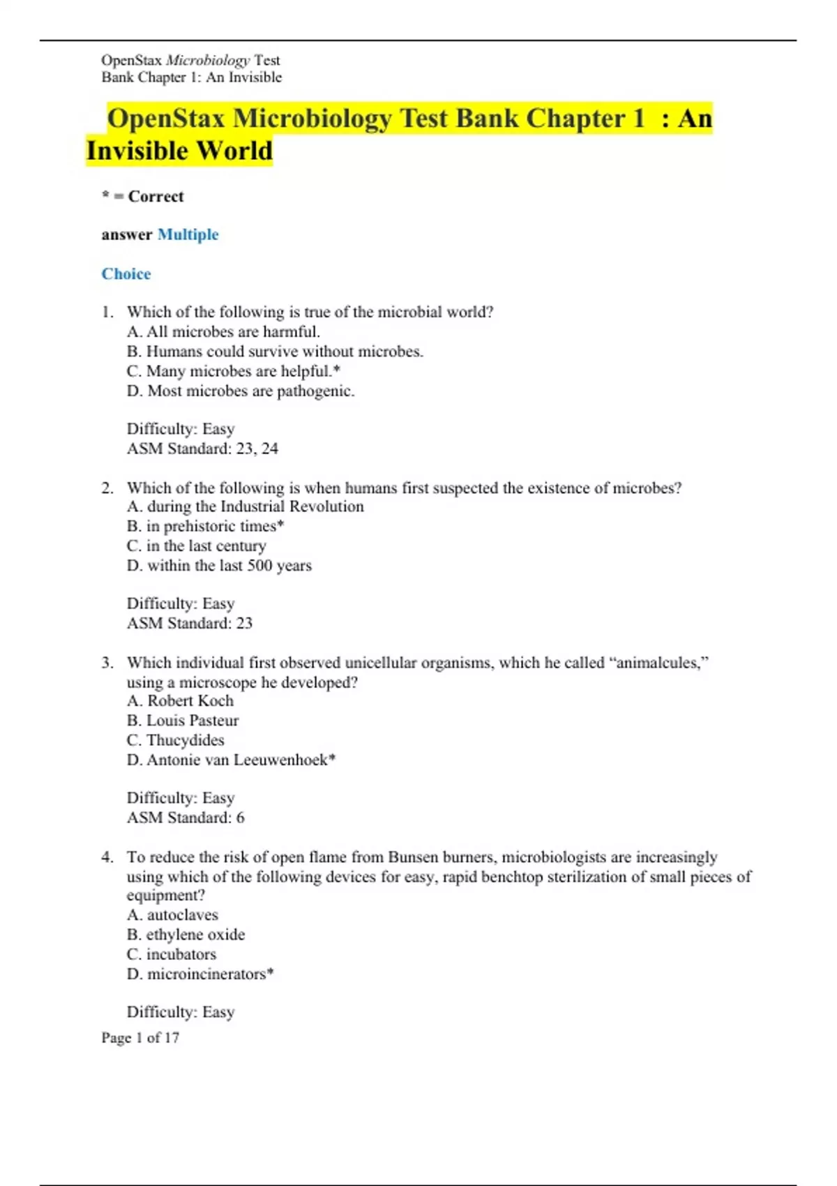 OpenStax Microbiology Test Bank Chapter 1 : An Invisible World * = Correct answer Multiple Choice 1. Which of the following is true of the microbial world? A. All microbes are harmful. B. Humans could survive without microbes. C. Many microbes are helpful.* D. Most microbes are pathogenic. Difficulty: Easy ASM Standard: 23, 24 2. Which of the following is when humans first suspected the existence of microbes? A. during the Industrial Revolution B. in prehistoric times* C. in the last century D. within the last 500 years Difficulty: Easy ASM Standard: 23 3. Which individual first observed unicellular organisms, which he called “animalcules,” using a microscope he developed? A. Robert Koch B. Louis Pasteur C. Thucydides D. Antonie van Leeuwenhoek* Difficulty: Easy ASM Standard: 6 4. To reduce the risk of open flame from Bunsen burners, microbiologists are increasingly using which of the following devices for easy, rapid benchtop sterilization of small pieces of equipment? A. autoclaves B. ethylene oxide C. incubators D. microincinerators* Difficulty: Easy ASM Standard: 36 OpenStax Microbiology Test Bank Chapter 1: An Invisible World Page 1 of 17 5. The Swedish botanist known for having developed an important biological classification system is which of the following people? A. Ernst Haeckel B. Carolus Linnaeus* C. Louis Pasteur D. Robert Whittaker Difficulty: Easy ASM Standard: N/A