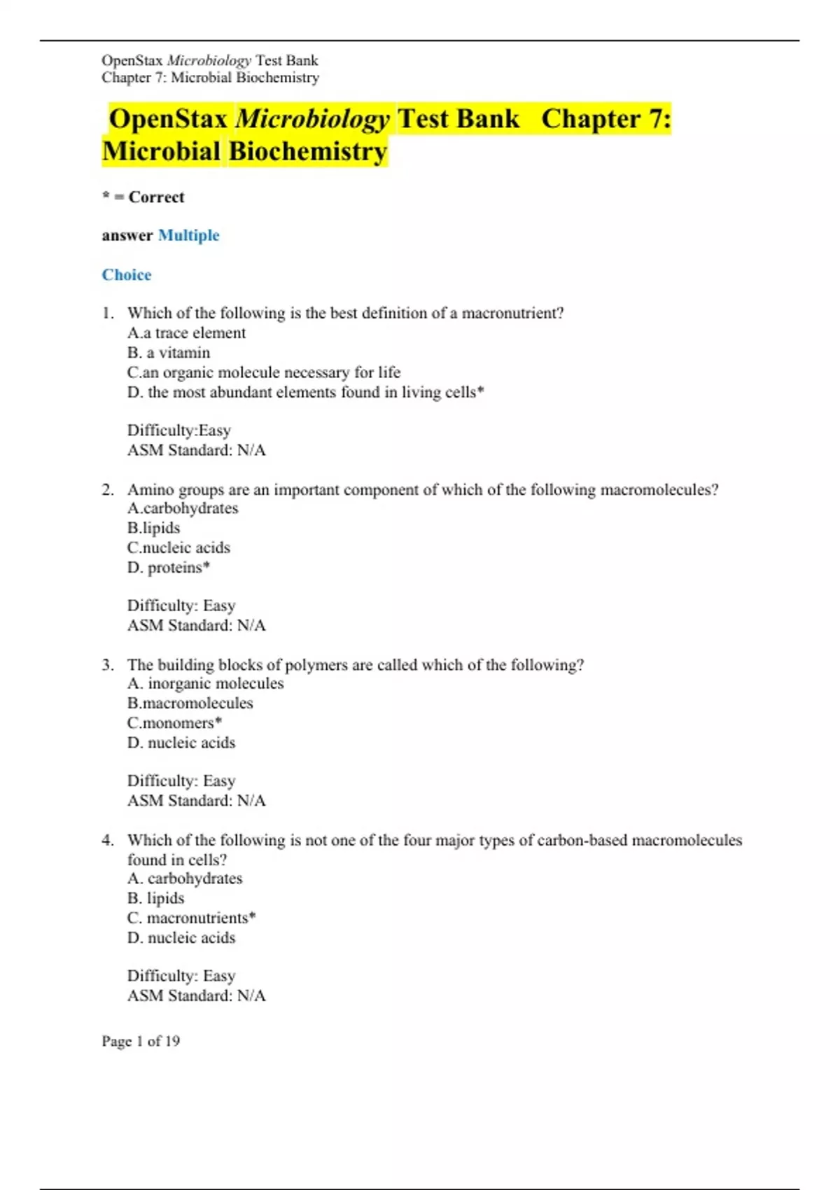 OpenStax Microbiology Test Bank Chapter 7: Microbial Biochemistry * = Correct answer Multiple Choice 1. Which of the following is the best definition of a macronutrient? A.a trace element B. a vitamin C. an organic molecule necessary for life D. the most abundant elements found in living cells* Difficulty:Easy ASM Standard: N/A 2. Amino groups are an important component of which of the following macromolecules? A.carbohydrates B.lipids C.nucleic acids D. proteins* Difficulty: Easy ASM Standard: N/A 3. The building blocks of polymers are called which of the following? A. inorganic molecules B.macromolecules C.monomers* D. nucleic acids Difficulty: Easy ASM Standard: N/A 4. Which of the following is not one of the four major types of carbon-based macromolecules found in cells? A. carbohydrates B. lipids C. macronutrients* D. nucleic acids Difficulty: Easy ASM Standard: N/A 5. Which of the following is the typical, stable shape of glucose in cells? A.a branched chain OpenStax Microbiology Test Bank Chapter 7: Microbial Biochemistry Page 1 of 19 B. a doublering