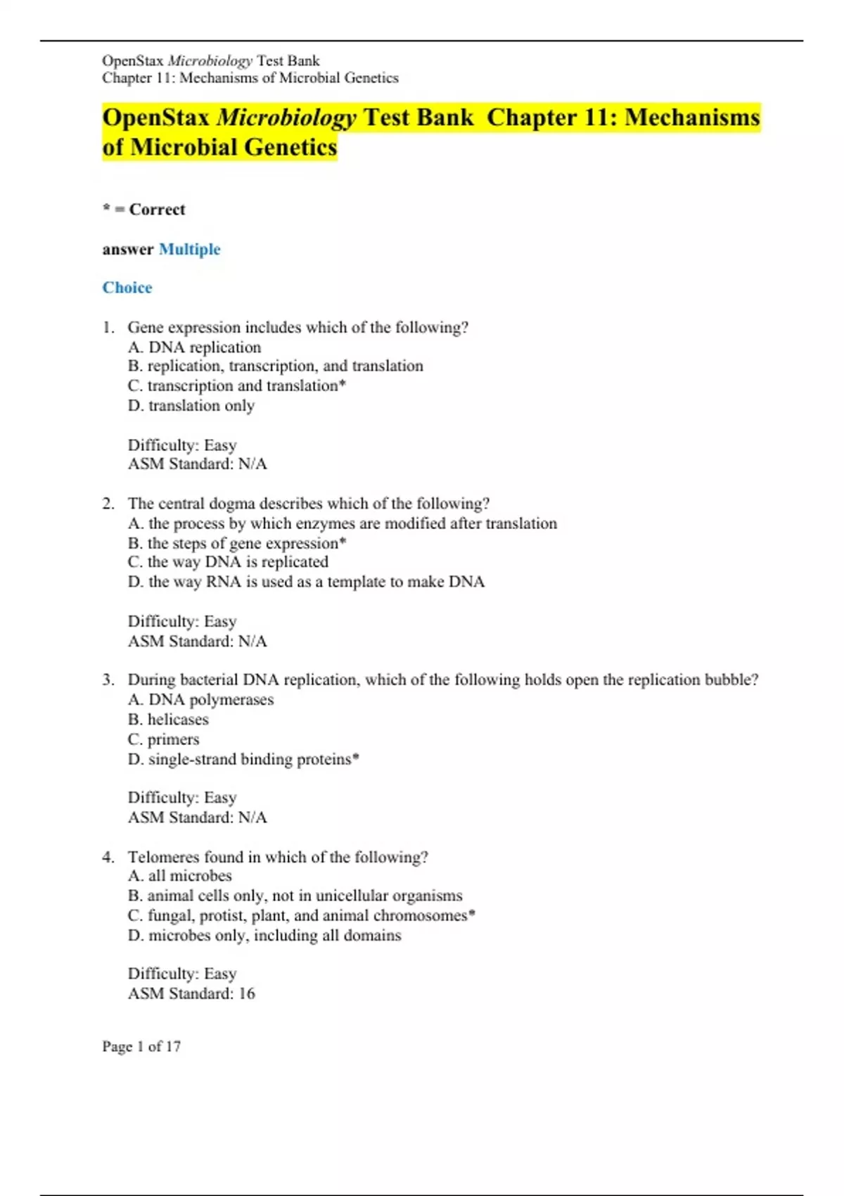 OpenStax Microbiology Test Bank Chapter 11: Mechanisms of Microbial Genetics * = Correct answer Multiple Choice 1. Gene expression includes which of the following? A. DNA replication B. replication, transcription, and translation C. transcription and translation* D. translation only Difficulty: Easy ASM Standard: N/A 2. The central dogma describes which of the following? A. the process by which enzymes are modified after translation B. the steps of gene expression* C. the way DNA is replicated D. the way RNA is used as a template to make DNA Difficulty: Easy ASM Standard: N/A 3. During bacterial DNA replication, which of the following holds open the replication bubble? A. DNA polymerases B. helicases C. primers D. single-strand binding proteins* Difficulty: Easy ASM Standard: N/A 4. Telomeres found in which of the following? A. all microbes B. animal cells only, not in unicellular organisms C. fungal, protist, plant, and animal chromosomes* D. microbes only, including all domains Difficulty: Easy ASM Standard: 16 5. Which of the following best describes the direction in which lagging strands are added? A. as 5′ to 3′ Okazaki fragments in an overall 3′ to 5′ direction only* OpenStax Microbiology Test Bank Chapter 11: Mechanisms of Microbial Genetics Page 1 of 17 B. as 5′ to 3′ Okazaki fragments in an overall 5′ to 3′ direction only C. in the 3′ to 5′ or 5′ to 3′ direction