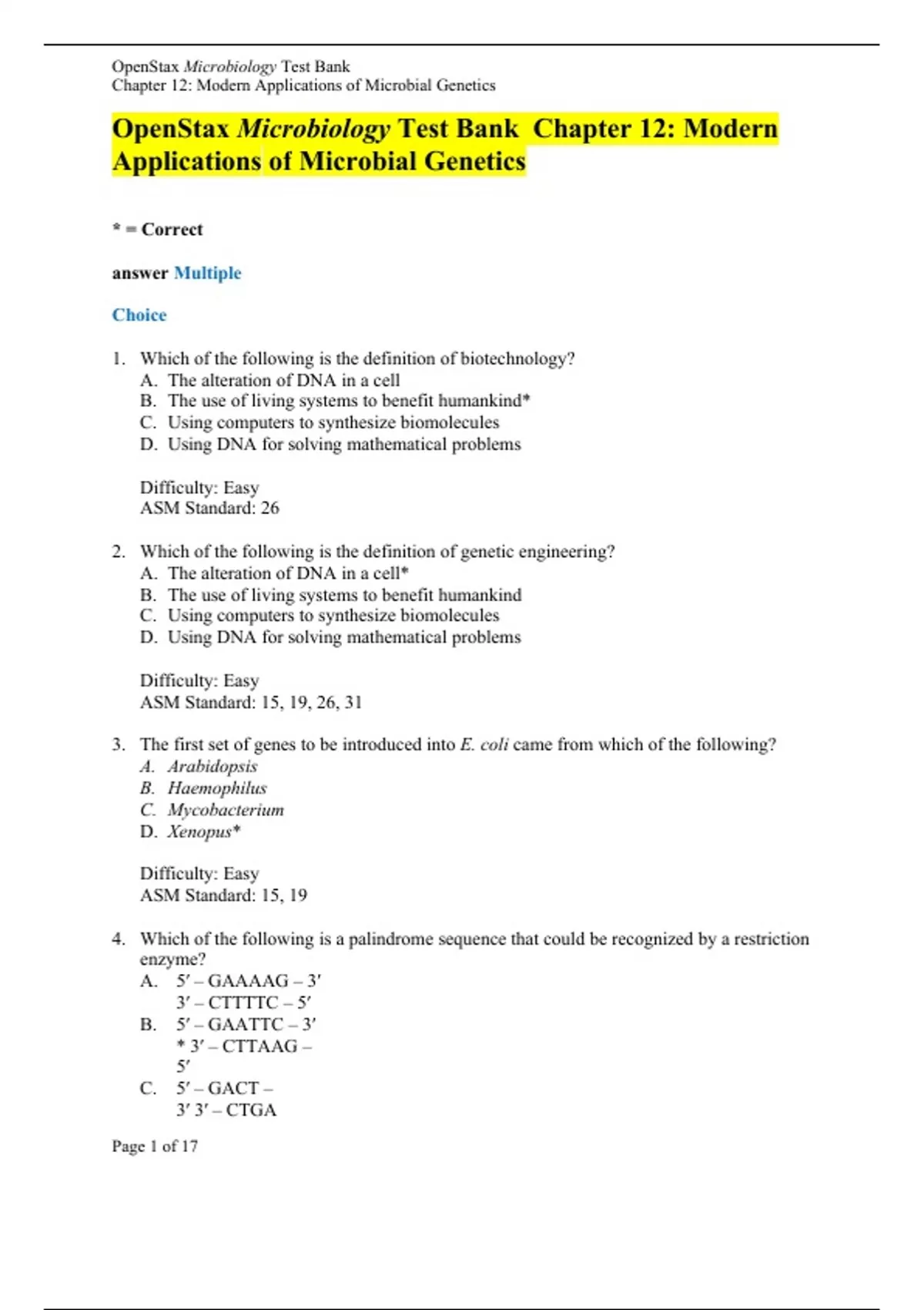 OpenStax Microbiology Test Bank Chapter 12: Modern Applications of Microbial Genetics * = Correct answer Multiple Choice 1. Which of the following is the definition of biotechnology? A. The alteration of DNA in a cell B. The use of living systems to benefit humankind* C. Using computers to synthesize biomolecules D. Using DNA for solving mathematical problems Difficulty: Easy ASM Standard: 26 2. Which of the following is the definition of genetic engineering? A. The alteration of DNA in a cell* B. The use of living systems to benefit humankind C. Using computers to synthesize biomolecules D. Using DNA for solving mathematical problems Difficulty: Easy ASM Standard: 15, 19, 26, 31 3. The first set of genes to be introduced into E. coli came from which of the following? A. Arabidopsis B. Haemophilus C. Mycobacterium D. Xenopus* Difficulty: Easy ASM Standard: 15, 19 4. Which of the following is a palindrome sequence that could be recognized by a restriction enzyme? A. 5′ – GAAAAG – 3′ 3′ – CTTTTC – 5′ B. 5′ – GAATTC – 3′ * 3′ – CTTAAG – 5′ C. 5′ – GACT – 3′ 3′ – CTGA – 5′ D. 5′ – GCCCC – 3′ 3′ – CGGGG –