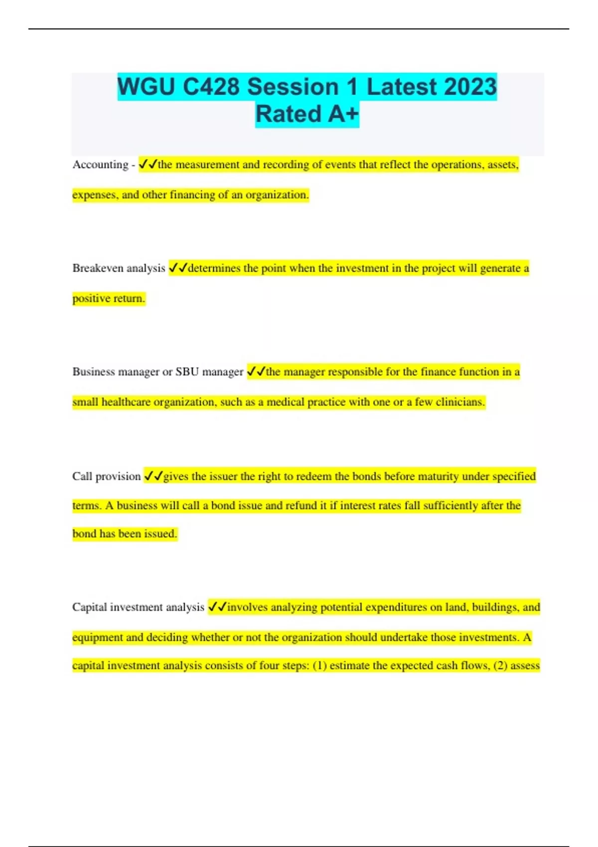 WGU C428 Session 1 Latest 2023 Rated A+ Accounting - the measurement and recording of events that reflect the operations, assets, expenses, and other financing of an organization. Breakeven analysis determines the point when the investment in the project will generate a positive return. Business manager or SBU manager the manager responsible for the finance function in a small healthcare organization, such as a medical practice with one or a few clinicians. Call provision gives the issuer the right to redeem the bonds before maturity under specified terms. A business will call a bond issue and refund it if interest rates fall sufficiently after the bond has been issued. Capital investment analysis involves analyzing potential expenditures on land, buildings, and equipment and deciding whether or not the organization should undertake those investments. A capital investment analysis consists of four steps: (1) estimate the expected cash flows, (2) assess the riskiness of those flows, (3) estimate the appropriate opportunity cost of capital, and (4) determine the project's profitability and breakeven characteristics. Capital structure The business's mix of debt and equity financing, often expressed as the percentage of debt financing. CFO chief financial officer, who typically reports directly to the chief executive officer (CEO) and is responsible for all finance activities within the organization. Compounding the process of determining the future value of a current cash flow or series of flows. Comptroller responsible for accounting and reporting activities. The comptroller (controller) direct managers with responsibility for specific functions, such as the patient accounts manager. Cost of debt the interest rate set on new debt. Cost of Equity the return required by owners to furnish equity capital. Debt the state of owing money. Debt contract is a legal document that spells out the rights and obligations of both lenders and borrowers. Discounting is the process of finding the present value of a future cash flow or series of flows. Discounted cash flow analysis uses time value of money techniques to estimate the value of an investment's expected cash flows. Equity the sum of the assets. Floating rate rate changes over time as interest rates in the economy rise and fall. For profit corporation - a legal business entity that is separate and distinct from its owners and managers. Health Care Finance - refers to the accounting and financial management principles and practices used within healthcare organizations to ensure the financial well being of the enterprise. 1. Micro - financial functions practiced by a health care organizations. 2. Macro - The system that societies use to pay for services delivered by health care organizations. Health Service Organizations - any entity that provides patient care services. Horizontal system a business entity that owns a group of similar providers, such as hospitals. Interest rates is the price paid to obtain debt capital. Internal rate of return (IRR) which is the discount rate that forces a project's NPV to equal zero, measures a project's expected rate of return. If a project's IRR is greater than its opportunity cost of capital, the project is expected to be profitable, and the higher the IRR, the more profitable the project. Limited Liability Company (LLC) a corporation that combines some features of a partnership with others of a corporation Limited partnership a partnership in which the general partners have most of the control and unlimited liability while the limited partners have little control and liability that is limited to their initial contribution. Limited liability partnership (LLP) a partnership that limits the professional (malpractice) liability of its members. Long Term Debt - debt that has a maturity greater than one year. Managerial Finance the use of theory, principles, and concepts developed to help managers make better financial decisions. Maturity the amount of time until a loan matures. Net present value (NPV) the sum of the present values of all the project's cash flows when discounted at the project's opportunity cost of capital. NPV measures a project's expected dollar profitability. An NPV greater than zero indicates that the project is expected to be profitable after all costs, including the opportunity cost of capital, have been considered. Furthermore, the higher the NPV, the more profitable the project. Patient capture the concept that once a patient enters the system at one point (e.g., a doctor's office), all services needed by that patient will be provided within the system. Partnership an unincorporated business that is created and owned by two or more people. Post audit - a post-audit is used to review the process to check the outcomes of individual investment projects after the initial investment is completed. This will help to improve the operations and the investment process. Professional corporation (PC) a type of corporate business organization in which the owner/ managers retain professional (medical) liability. Called a professional association in some states. Proprietorship a simple form of business owned by one person. Also called sole proprietorship. Residual earnings the earnings (profits) of a business after all expenses (including interest on debt financing) have been paid Restrictive covenants provisions designed to protect bondholders against detrimental managerial actions. Return on investment (ROI) - assess project profitability. Treasurer responsible for the acquisition and management of capital (funds). The treasurer direct managers with responsibility for specific functions, such as the cash manager Trustee assigned to make sure that the terms of a bond contract are carried out. Vertical system An entity that owns a group of related, but not identical, providers, such as hospitals, medical practices, and nursing homes.
