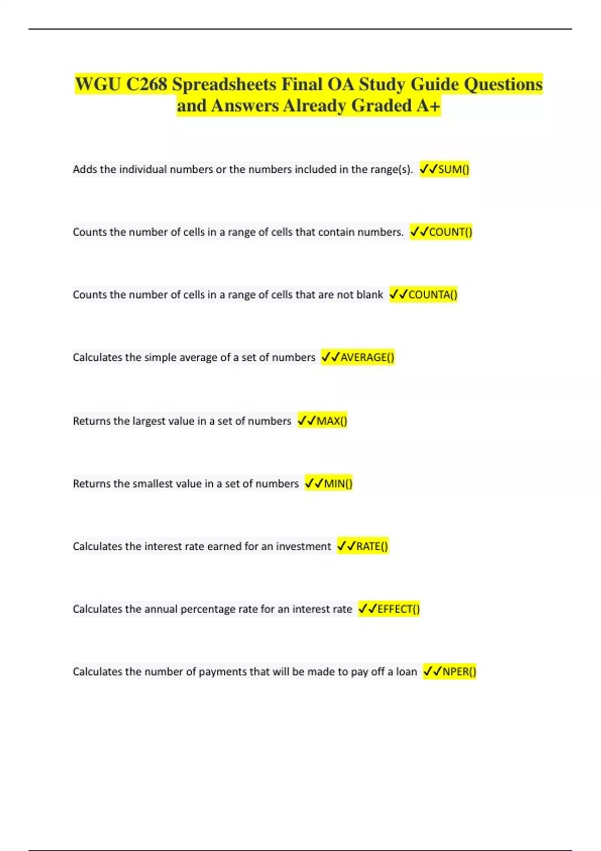 WGU C268 Spreadsheets Final OA Study Guide Questions and Answers Already Graded A+ Adds the individual numbers or the numbers included in the range(s). SUM() Counts the number of cells in a range of cells that contain numbers. COUNT() Counts the number of cells in a range of cells that are not blank COUNTA() Calculates the simple average of a set of numbers AVERAGE() Returns the largest value in a set of numbers MAX() Returns the smallest value in a set of numbers MIN() Calculates the interest rate earned for an investment RATE() Calculates the annual percentage rate for an interest rate EFFECT() Calculates the number of payments that will be made to pay off a loan NPER() Calculates the payment amount for a loan PMT() Calculates the current value of an investment (accounting for compound interest) PV() Calculates the future value of an investment FV() Combines Boolean expressions to determine if ALL of the combined expressions are TRUE AND() Combines Boolean expressions to determine if ANY of the combined expressions are TRUE OR() Check to see if a Boolean expression is not evaluated as TRUE NOT() Build on Boolean logic and specify the results depending on the results of the Boolean expression IF() Determine (count) the number of cells within a range of cells that contain a specific value COUNTIF() Calculate the total (sum) for a set of values that match a specific criterion SUMIF()